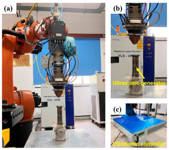 Overview of the experimental setup: (a) DED system, (b) ultrasonic generator, and (c) ultrasonic controller.