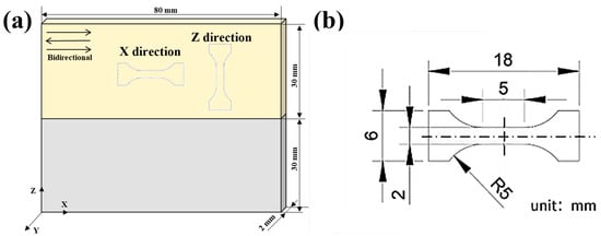 (a) The schematic diagram of the deposited thin-walled Inconel 718 samples, and (b) the sample dimensions for tensile tests.