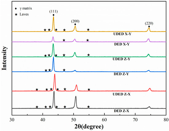 Figure 4 shows the XRD patterns acquired from the middle regions of different cross-sections of DED and UDED thin-walled Inconel 718 samples. The diffraction peaks (111), (200), and (220) of the face-centered cubic γ matrix phase were clearly identified. A comparison between the diffraction profiles revealed significant differences in crystallographic preferred orientation for an identical plane of DED and UDED samples. Moreover, the DED samples exhibited different textures or texture magnitudes between the Z–X, Z–Y, and X–Y planes, whereas the UDED samples showed good consistency across these planes. The crystallographic preferred orientation of the two samples was further analyzed via EBSD in subsequent sections. Furthermore, some weak diffraction peaks corresponding to the Laves phase were also detected in both DED and UDED samples. Additionally, no diffraction peaks of the δ phase or MC carbides were detected, probably due to their low content.