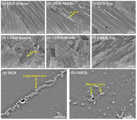 Figure 5 displays the microstructures in the bottom, middle, and top regions (the Z–X planes) of the DED and UDED thin-walled Inconel 718 samples. In this figure, the gray-black areas represent the matrix, while the bright regions (indicated by yellow arrows) surrounding the matrix phase are Laves phases. Figure 5a–c reveal the presence of continuous chain-like Laves phases in all regions of the DED sample. The morphology of the long-chain Laves phase is depicted in Figure 5g, where the phase length ranges from tens to hundreds of microns, significantly larger than the phase cross-section size. Figure 5d–f show that in the bottom and middle regions of the UDED sample, the Laves phases were predominantly discrete, fine, granular, and randomly distributed. The granular Laves phase has a size within a few microns, as shown in Figure 5h. Nevertheless, in the top region of the UDED sample in Figure 5f, a certain number of long-chain Laves phases appeared. Additionally, for DED and UDED samples, the morphology and distribution of Laves phase in the Z–Y and X–Y planes were similar to those in the Z–X planes presented here.