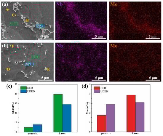 Chemical composition analysis of DED and UDED thin-walled Inconel 718 samples (the Z–X planes): (a) EDS mapping of DED sample, (b) EDS mapping of UDED sample, and comparisons of (c) the Nb content and (d) the Mo content in the γ matrix and Laves phase.