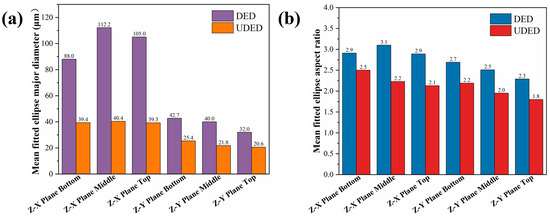 Matrix grain size and shape characteristics of DED and UDED thin-walled Inconel 718 samples: (a) mean fitted ellipse major diameter, and (b) mean fitted ellipse aspect ratio.