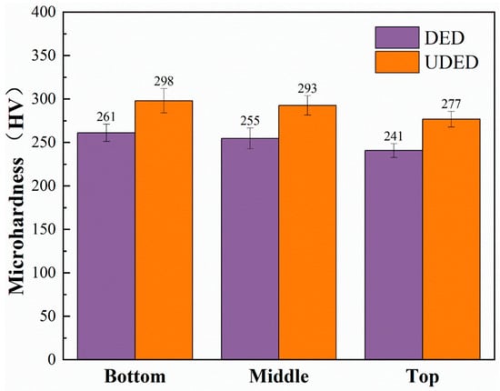 To investigate the effect of ultrasonic vibration on the mechanical properties of deposited thin-walled Inconel 718 samples, we measured the microhardness on the transverse sections (i.e., the Z–X planes). The reported data was the average value of the three repeated measurements, and the distance between two neighboring measurement points was 500 μm. Figure 10 presents the microhardness values in the bottom, middle, and top regions of DED and UDED samples. For the DED sample, the average values were 261 HV (bottom), 255 HV (middle), and 241 HV (top), and in the UDED case, they were 298 HV (bottom), 293 HV (middle), and 277 HV (top). Obviously, as the deposition height increased, the microhardness values for the two samples decreased slightly. Moreover, at an identical height, the UDED samples showed an approximately 15% increase in microhardness compared to the DED samples.