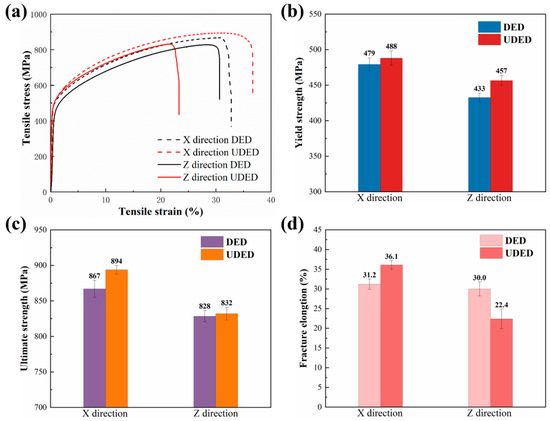 Figure 11 illustrates the typical tensile curves (Figure 11a) of the DED and UDED thin-walled Inconel 718 samples, and the statistical results of YS (Figure 11b), UTS (Figure 11c), and elongation after fracture (EL, as seen in Figure 11d). For samples tested in the X direction, the DED sample exhibited a YS of 479 ± 9 MPa, a UTS of 867 ± 12 MPa, and an EL of 31.2 ± 1.3%. In contrast, the UDED sample had a YS of 488 ± 10 MPa, a UTS of 894 ± 6 MPa, and an EL of 36.1 ± 1.1%. For samples tested in the Z direction, the DED sample displayed a YS of 433 ± 6 MPa, a UTS of 828 ± 8 MPa, and an EL of 30 ± 1.8%, while the UDED sample exhibited a YS of 457 ± 7 MPa, a UTS of 832 ± 9 MPa, and an EL of 22.4 ± 2.5%. It is apparent that the UDED sample showed an enhancement in the strength when deformed along either X or Z directions, and along the X direction, its EL was superior to that of the DED sample, but along the other direction, a decrease in the EL was obtained.