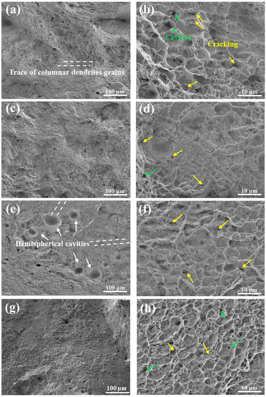 Figure 12 shows the typical fracture morphologies of DED and UDED thin-walled Inconel 718 samples after tensile tests. The fracture surface of the X-direction-tested DED sample exhibited a dendritic trace (indicated by the white dotted lines in Figure 12a), which may be left by the fracture of the columnar matrix grains. Several cavities (indicated by the green arrows in Figure 12b) were observed in dimples, while severe cracking (indicated by the yellow arrows) was formed by the separation of large Laves phases from the γ matrix. For the X-direction-tested UDED sample, its fracture morphology in Figure 12c was similar to that of the DED sample (Figure 12a), but its magnified fracture morphology in Figure 12d displayed densely packed, fine dimples. The observation was consistent with the superior ductility of the X-direction-tested UDED sample (Figure 11a). After the Z-direction tensile test, there are lots of hemispherical cavities (indicated by the white arrows in Figure 12e) on the fracture surface of the DED sample, while a cavity-free morphology can be seen in the UDED sample (Figure 12g). The magnified SEM images in Figure 12f,h indicated a similar ductile fracture morphology for the two samples tested along the Z direction.