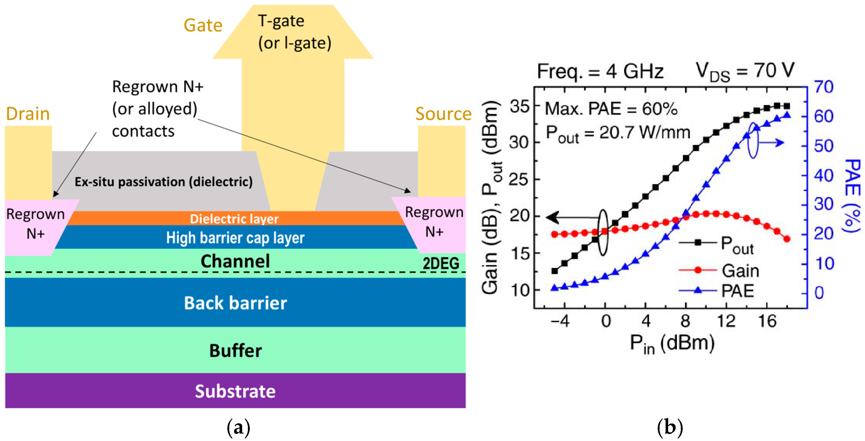 - Romanczyk, B. Record 34.2% Efficient mm-Wave N-Polar AlGaN/GaN MISHEMT at 87 GHz|Request PDF. Available online: https://www.researchgate.net/publication/307920761_Record_342_efficient_mm-wave_N-polar_AlGaNGaN_MISHEMT_at_87_GHz (accessed on 14 September 2025).