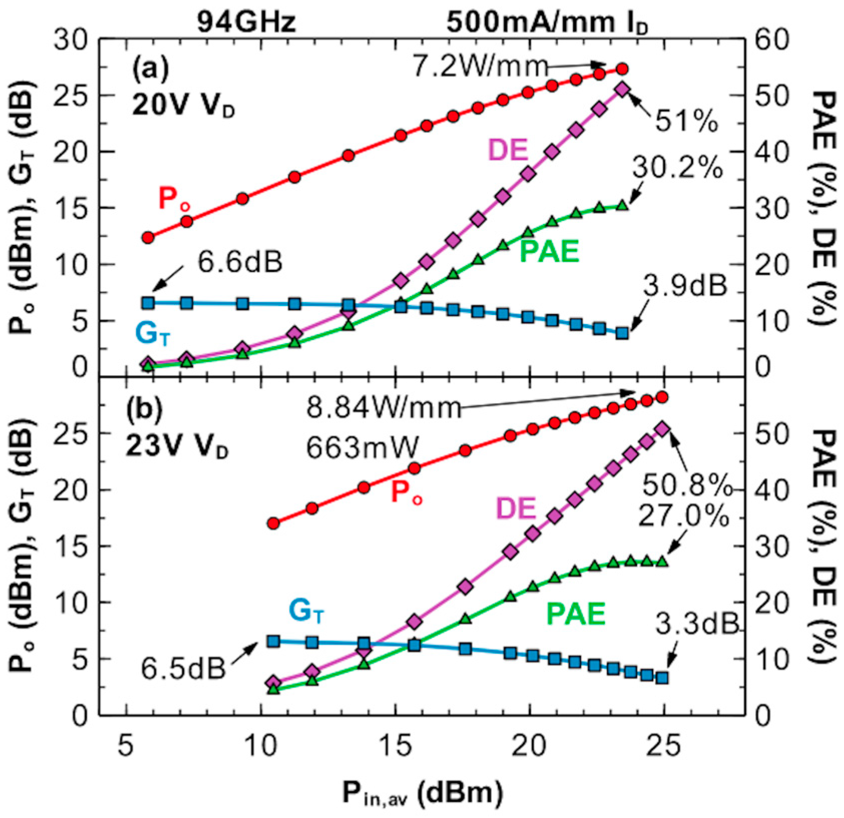 - Romanczyk, B.; Guidry, M.; Wienecke, S.; Li, H.; Ahmadi, E.; Zheng, X.; Keller, S.; Mishra, U.K. W-band N-polar GaN MISHEMTs with high power and record 27.8% efficiency at 94 GHz. In Proceedings of the 2016 IEEE International Electron Devices Meeting (IEDM), San Francisco, CA, USA, 3–7 December 2016; pp. 3.5.1–3.5.4. [Google Scholar] [CrossRef]