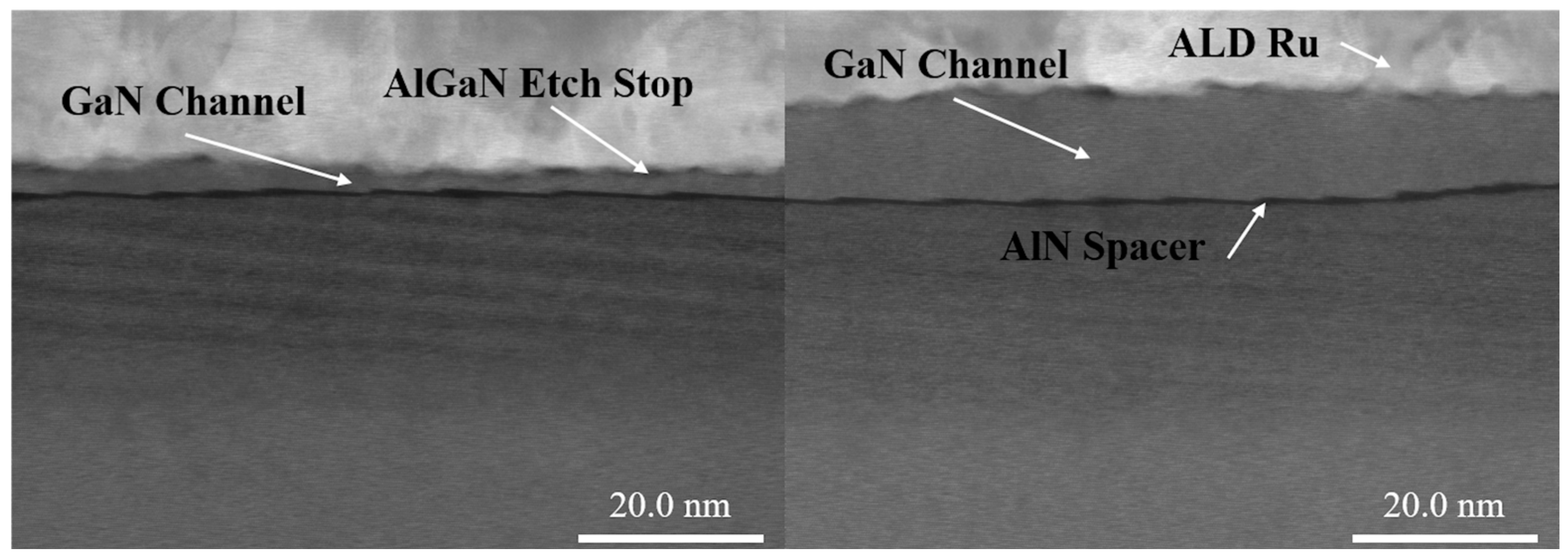 - Odabasi, O.; Mohanty, S.; Khan, K.; Ahmadi, E. N-Polar GaN Deep Recess HEMT with Atomic Layer Deposition HfO2 as Gate Insulator. IEEE Trans. Electron Devices 2023, 70, 4572–4577. [Google Scholar] [CrossRef]