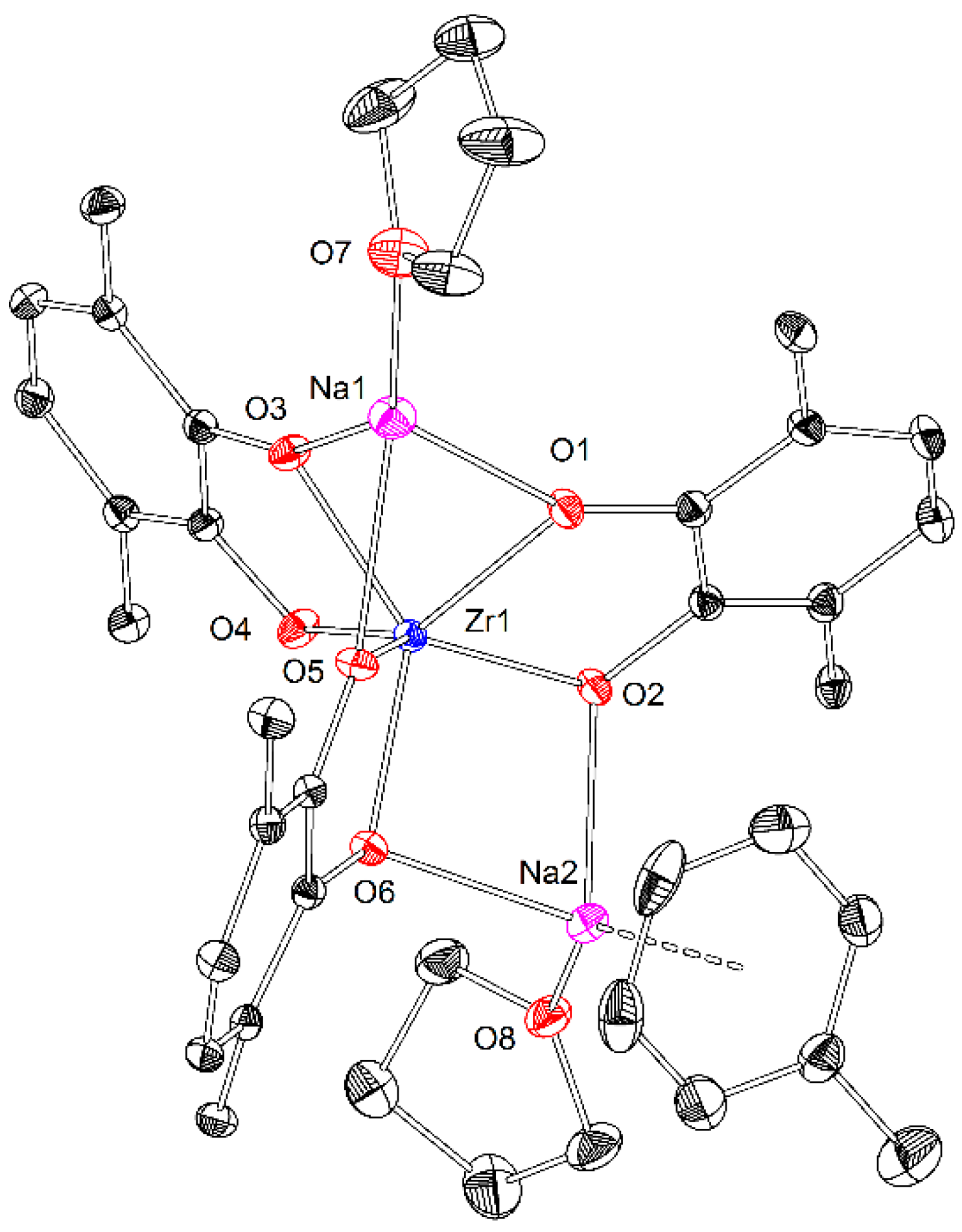 3.1. Synthesis and Structure of the Complex [Na2Zr(Cat36)3(THF)2(C7H8)] (1)