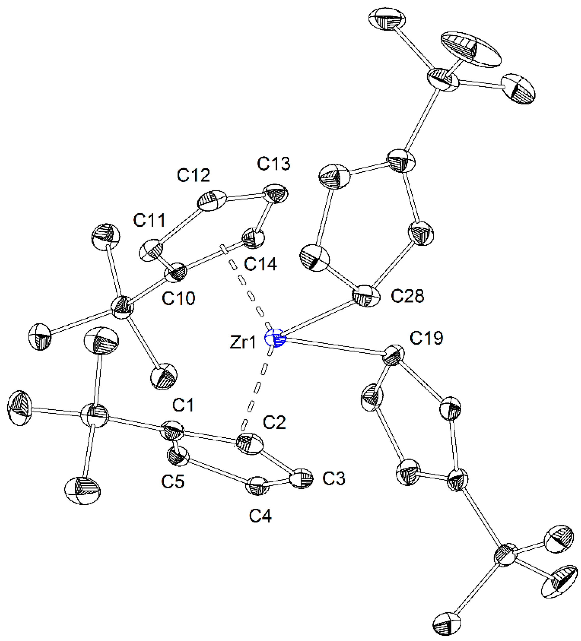 - Rogers, R.D.; Bynum, R.V.; Atwood, J.L. Crystal and Molecular Structure of Tetra (Cyclopentadienyl) Zirconium. J. Am. Chem. Soc. 1978, 100, 5238–5239. [Google Scholar] [CrossRef]