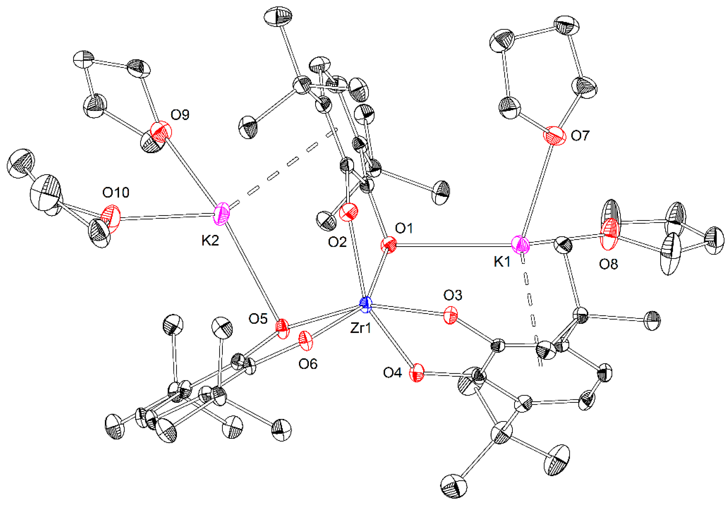 3.4. Synthesis and Structure of the Complex of [K2Zr(Cat36)3(THF)4] (3)