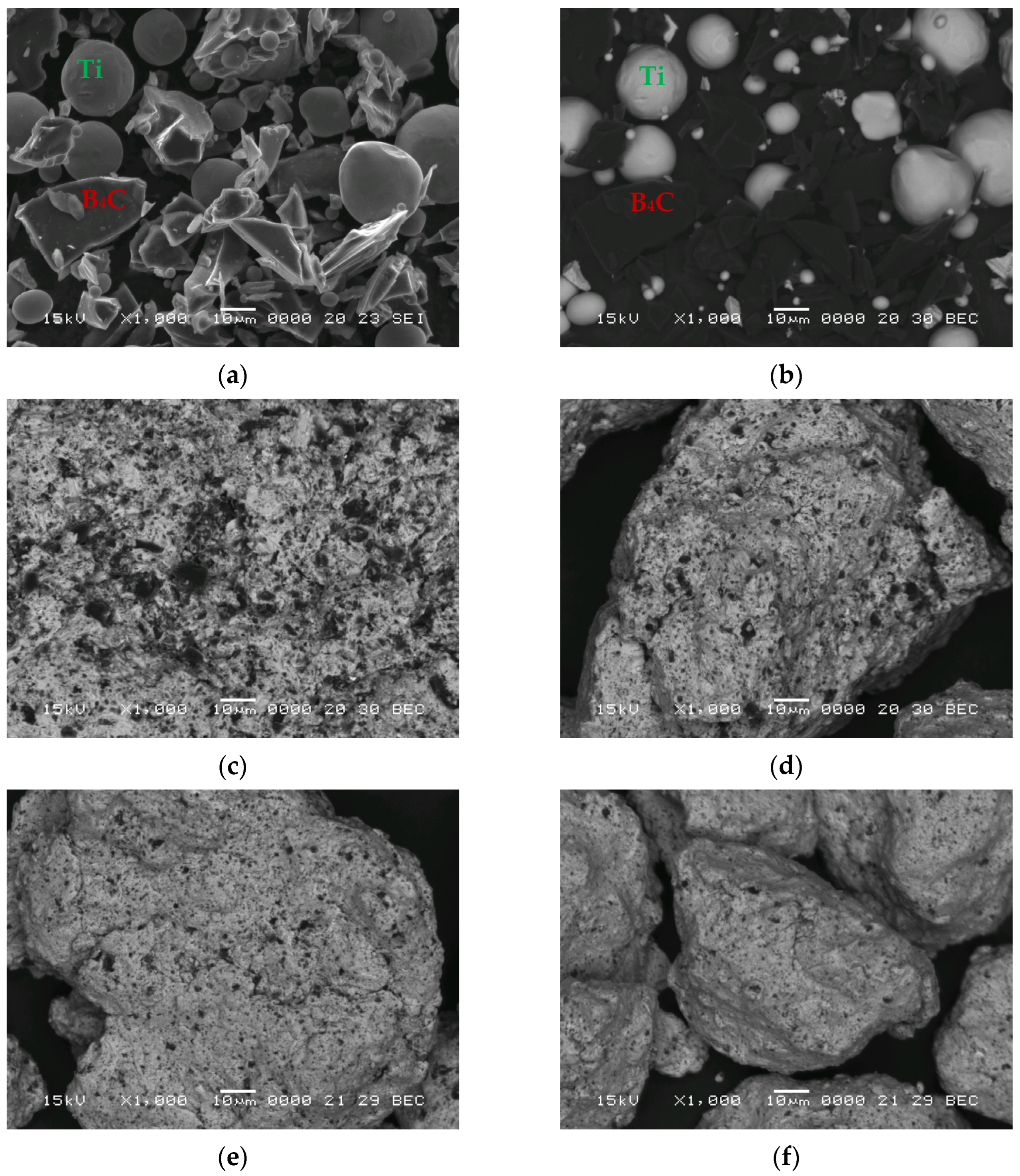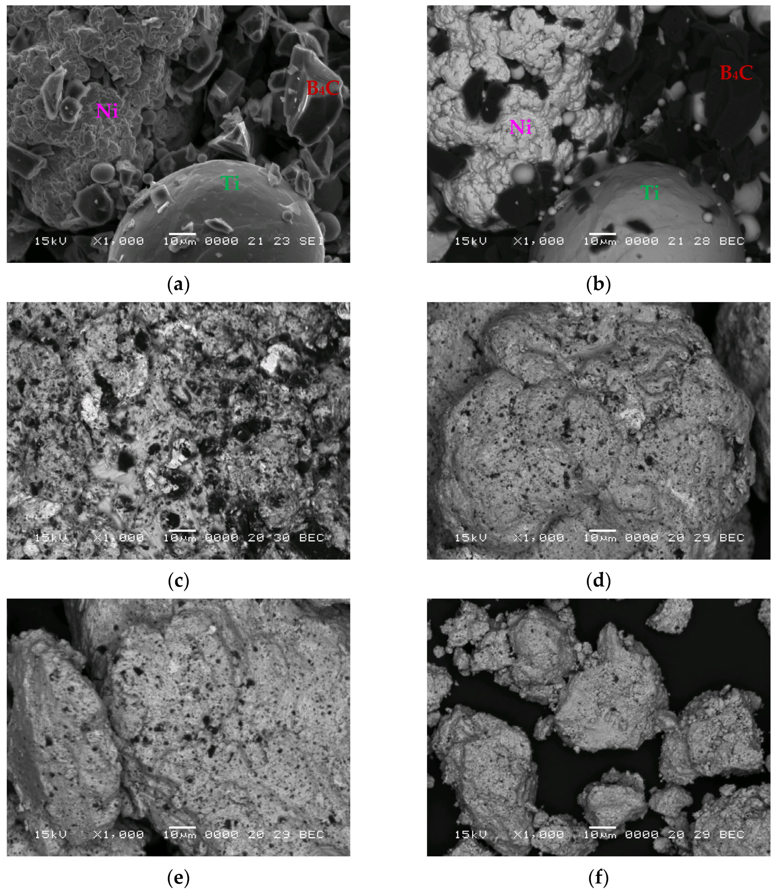 In the case of the [Ti + B4C + Ni] composite powders, a higher oxygen content may also be due to the morphology of the powder particles. It is known that, as a result of in situ reactions that occur during mechanical milling (according to XRD analyses), porosity may occur due to the change in the phases’ specific volumes.