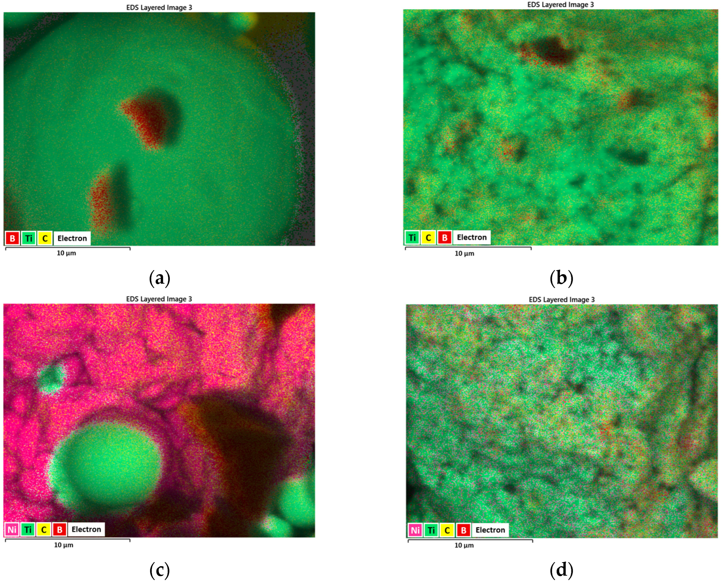 Figure 3b,d), it can be observed that boron and carbon are present in the matrix, arranged in the immediate vicinity of the B