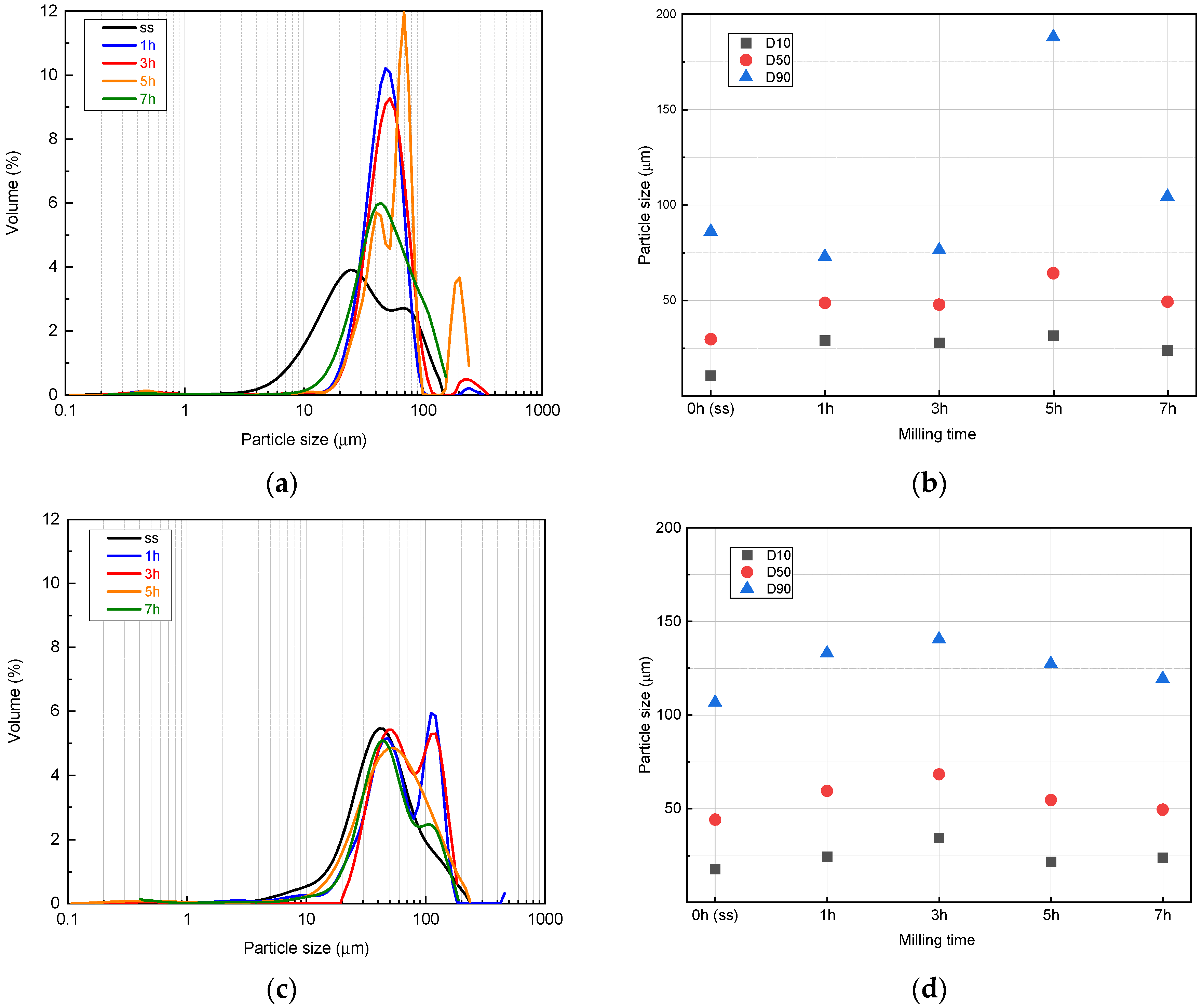 Figure 4d—D90). For the powders milled for 7 h, for both types of powders, the D50 and D10 values are approximately equal, around 49 µm and 24 µm, respectively (
