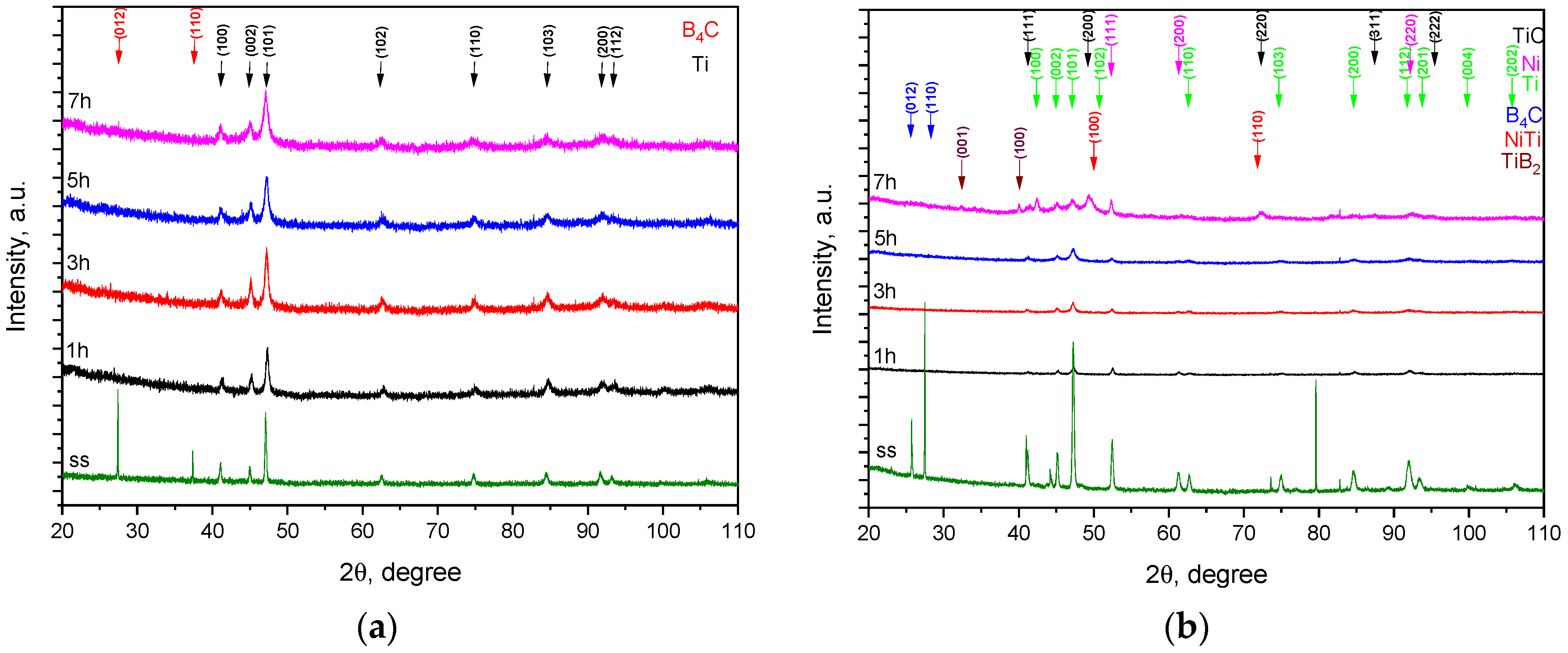 4C, its amorphous structure, and possible interface reaction do not allow us to see diffraction peaks in the diffraction pattern. With the increase in milling time, the peaks corresponding to titanium broaden, and their intensity decreases due to the decrease in crystallite size and the induced internal stresses upon the milling process. XRD analyses of the [Ti + B