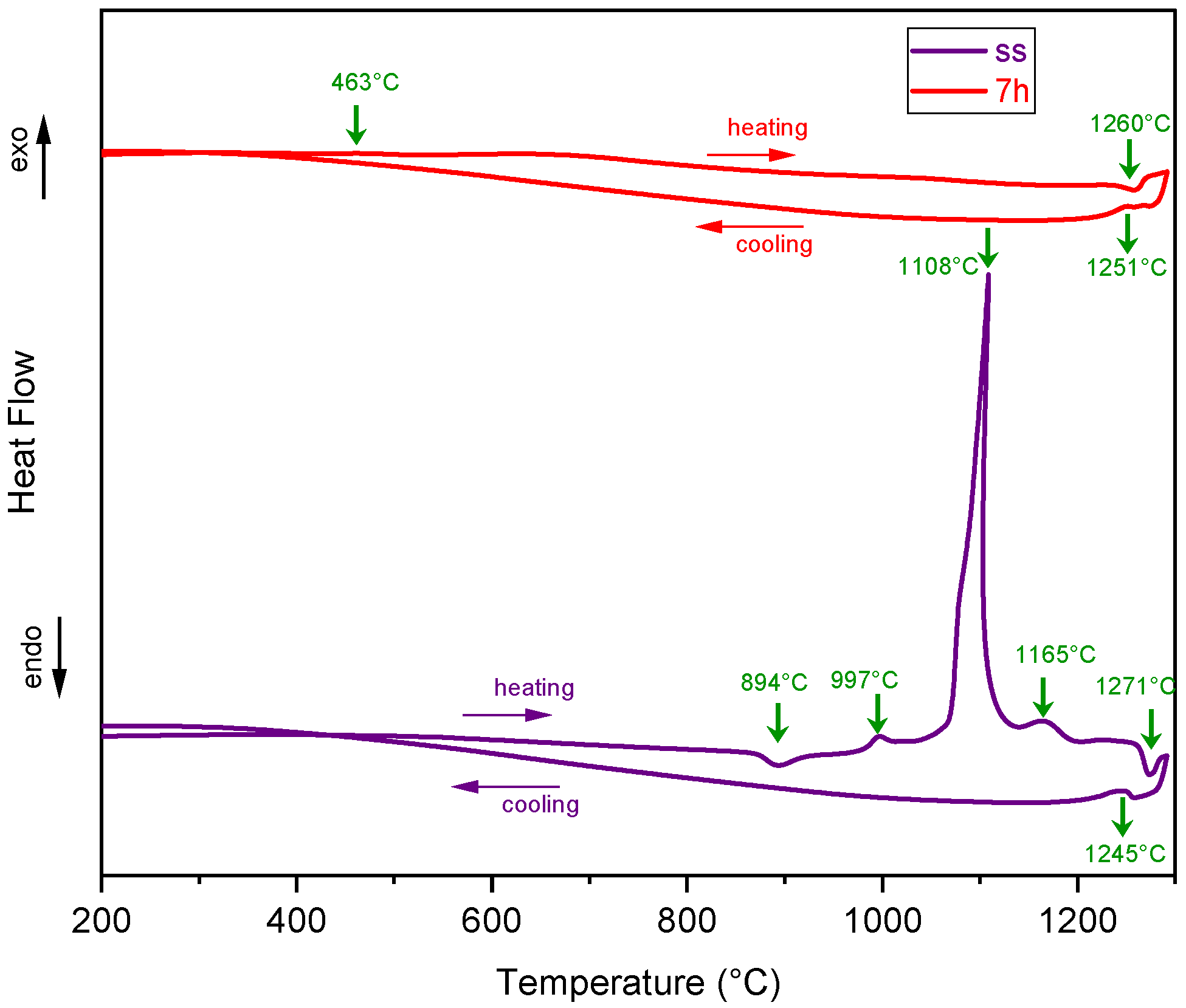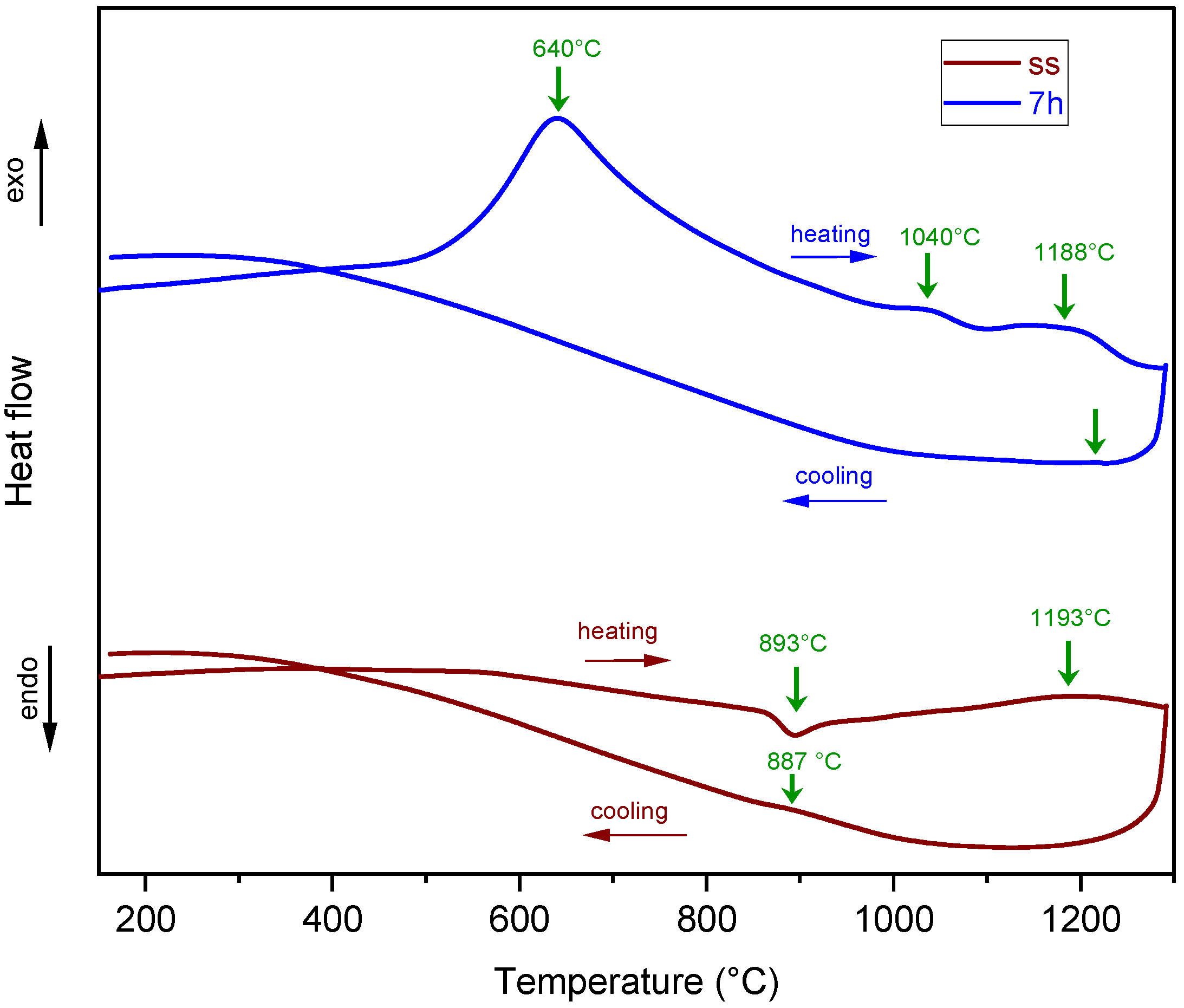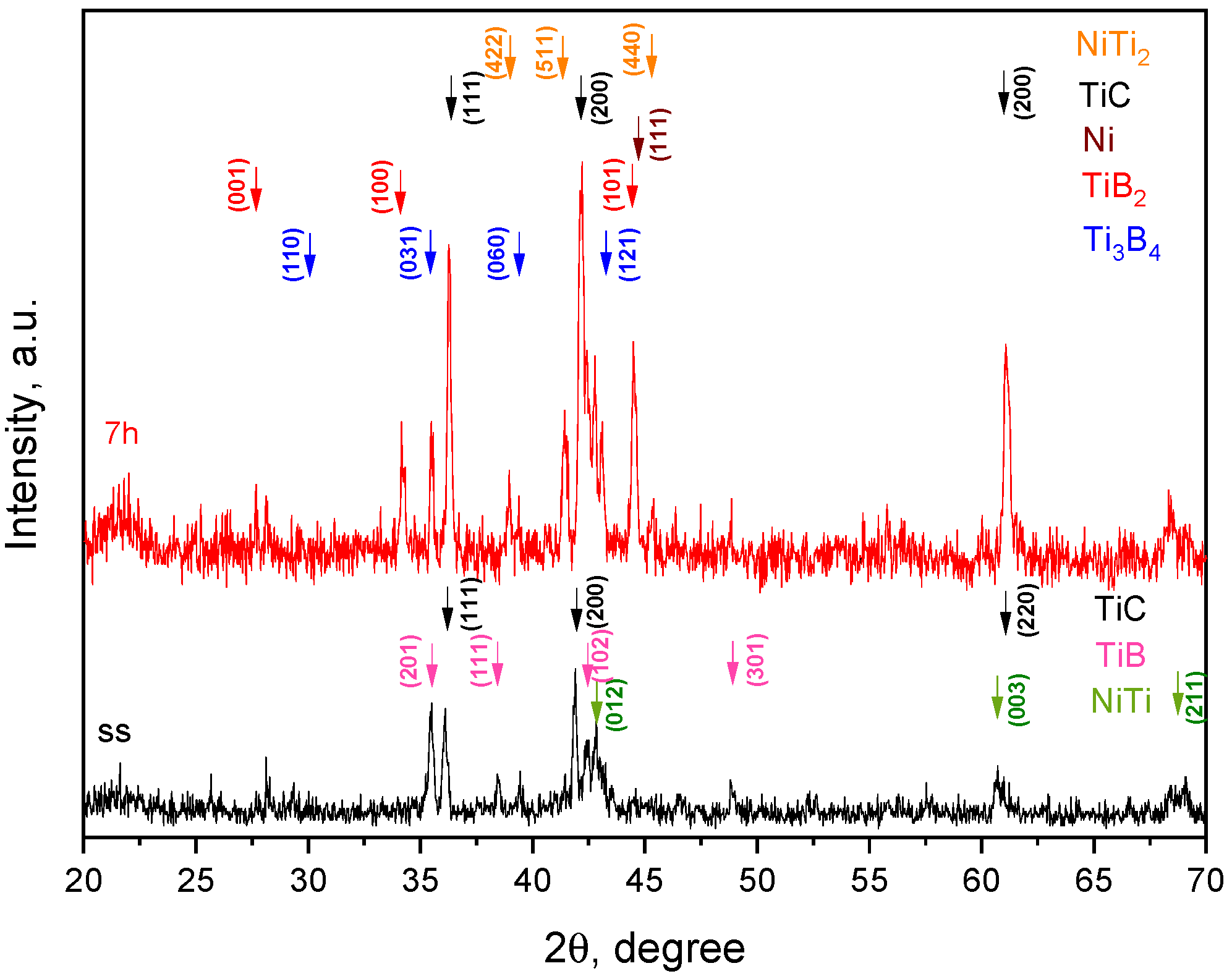 In the case of the mixture milled for 7 h, no intense peaks are recorded on the DSC curve, except around the melting temperature of the nickel-rich NiTi compound (endothermic peak at 1260 °C) and upon cooling (exothermic peak at approximately 1251 °C). The XRD analysis of the [Ti + B