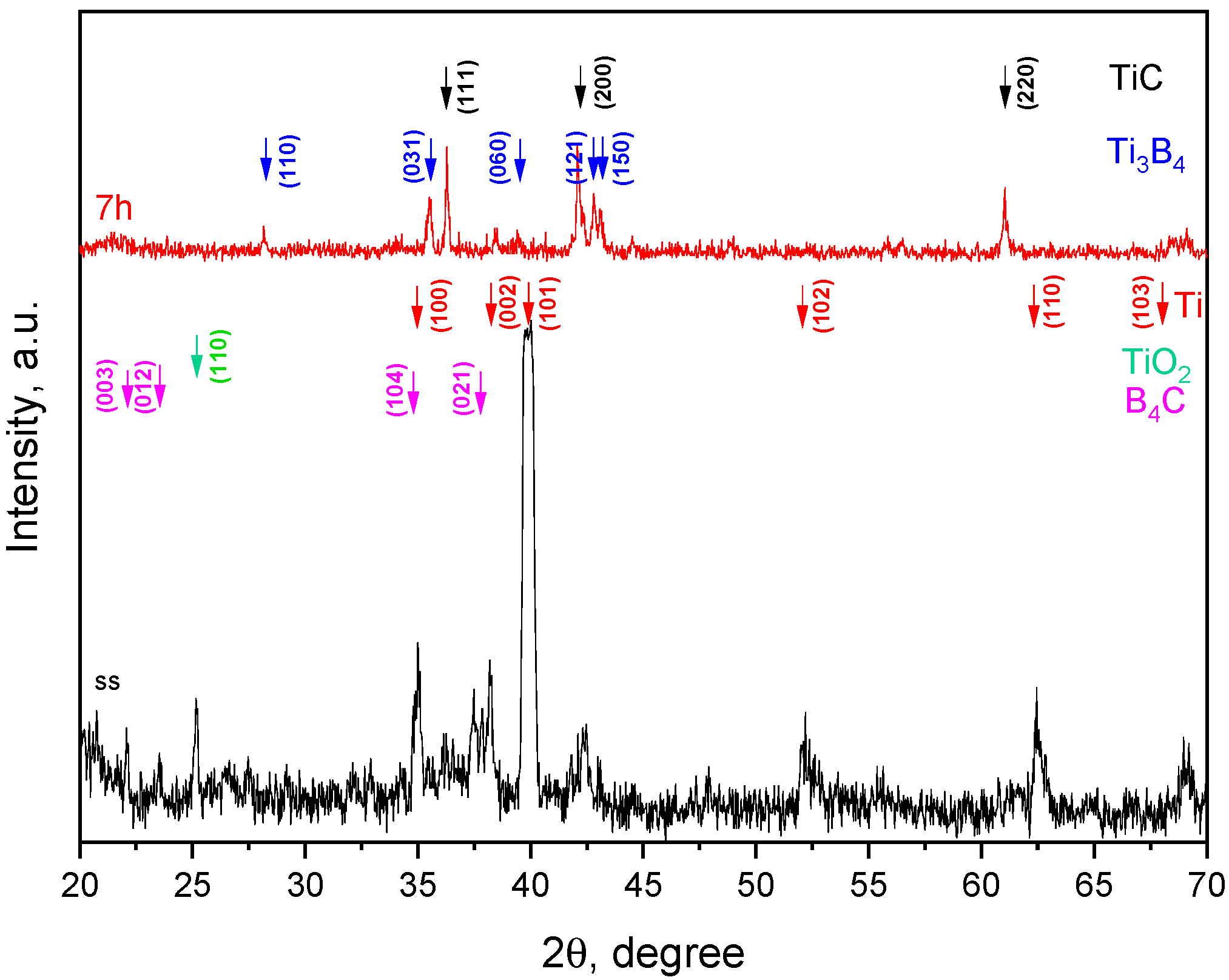 2 were identified. The reactions upon increasing the duration of mechanical milling in a high-energy planetary mill have already been proven. It was shown that it is possible to form other compounds in the Ti-B