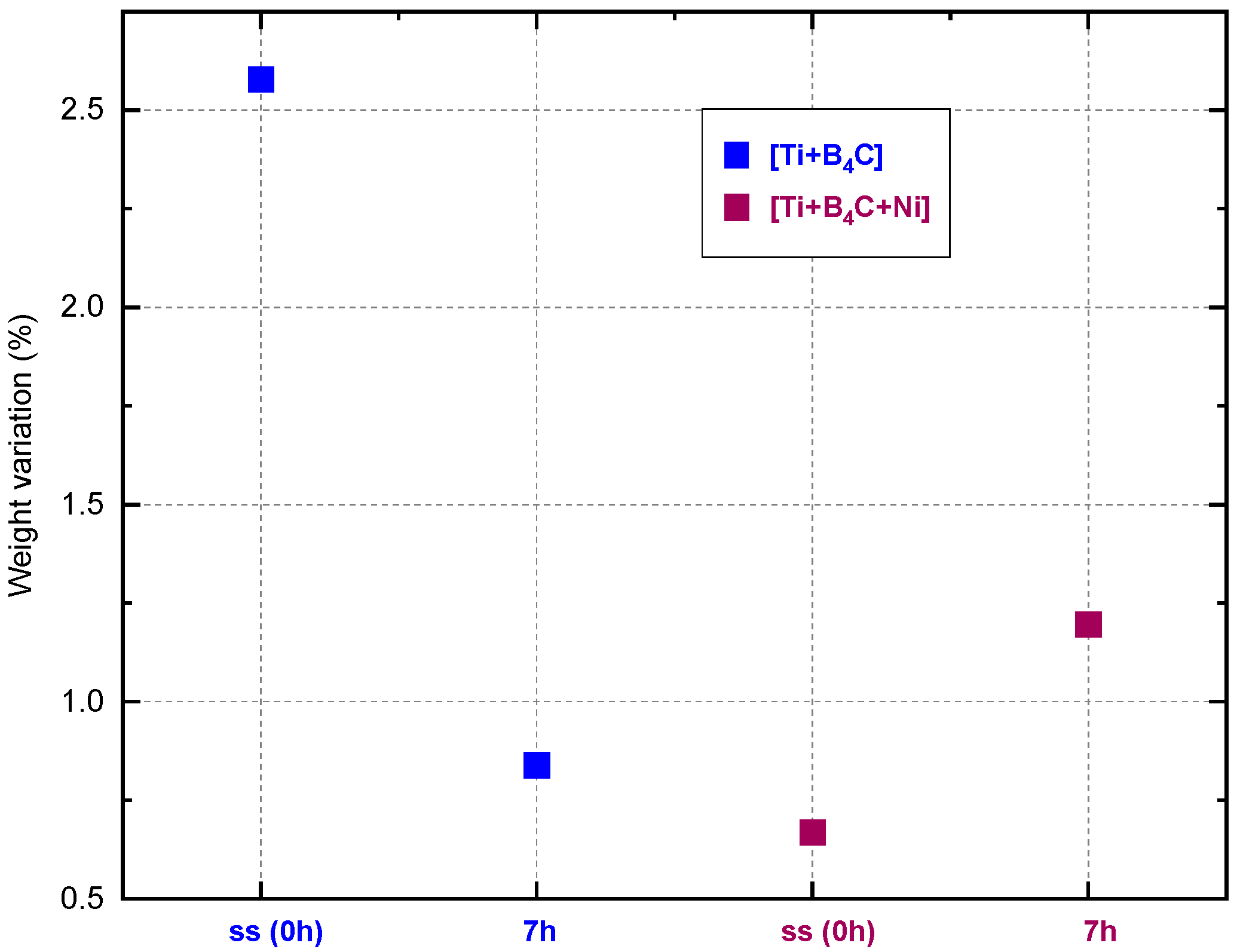Figure 10 shows the data obtained from DSC-TG analysis regarding the weight variation after heating to 1300 °C. A greater weight gain is observed for the initial [Ti + B