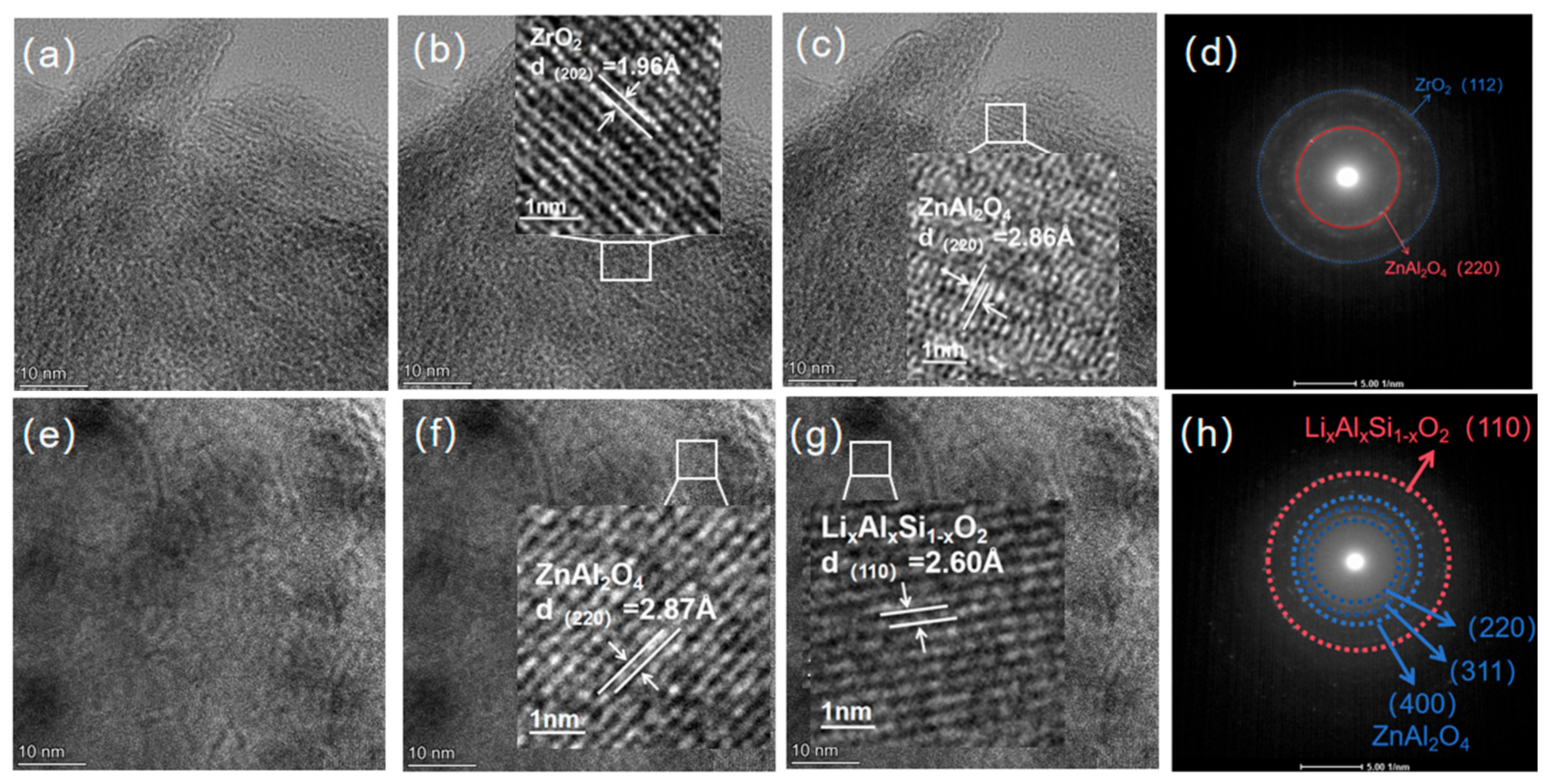 - Kleebusch, E.; Patzig, C.; Höche, T.; Rüssel, C. Effect of the concentrations of nucleating agents ZrO2 and TiO2 on the crystallization of Li2O–Al2O3–SiO2 glass: An X-ray diffraction and TEM investigation. J. Mater. Sci. 2016, 51, 10198–10209. [Google Scholar] [CrossRef]
