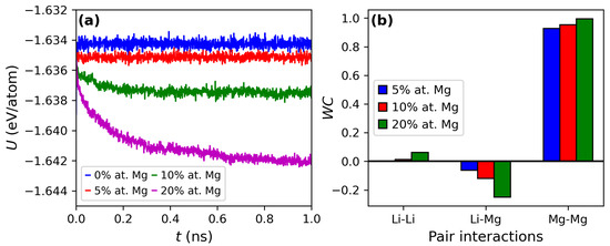 where is the probability to find a j-type atom around a i-type atom, and is the concentration of a j-type atom in the sample. Positive values indicate repulsion, while negative values indicate attraction. Figure 1b shows the values for the 5, 10, and 20% at. Mg samples. Values close to zero are observed for Li-Li interactions, reflecting that the sample consists of a Matrix of Li atoms. A decreasing trend is observed for Li–Mg interactions as the Mg content increases, indicating that these species tend to cluster, in agreement with the B2 crystalline structure that is formed when Li and Mg are present in equiatomic proportions [1,33]. Lastly, large positive values are observed for Mg–Mg interactions, indicating that Mg atoms tend to repel each other.