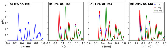 (a) Radial distribution function (g(r)) for the Li sample and (b) partial radial distribution functions for the (b) 5% at. Mg, (c) 10% at. Mg., and (d) 20% at. Mg.