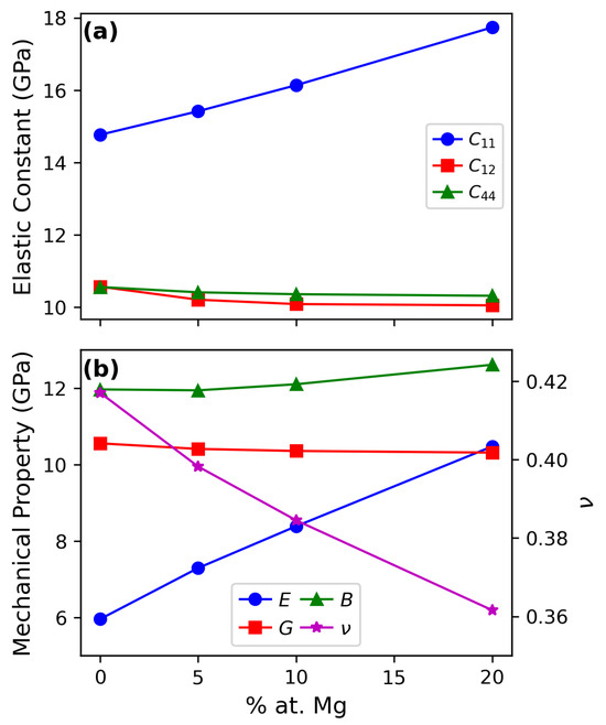 Mechanical characterization was performed to shed light into the elastic response of the Li-Mg alloys. Figure 3 shows the variation of the stiffness tensor components and derived mechanical properties of Li–Mg alloys as a function of Mg content. As shown in Figure 3a, increases with Mg addition, indicating that the alloy becomes stiffer against uniaxial deformation. In contrast, both and exhibit minor variations, indicating that the resistance to shear and lateral deformation remains almost the same across the different compositions under consideration. The mechanical properties were derived from the stiffness tensor components according to the following expression for an isotropic cubic metal