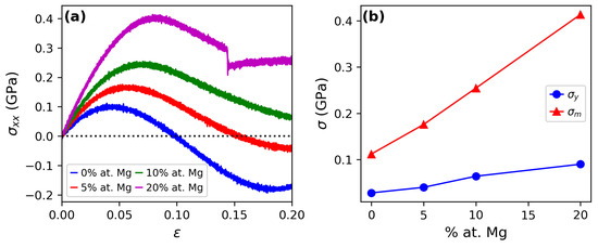 Uniaxial tensile tests were performed to evaluate the mechanical response of the Li-Mg alloys under external loading. Figure 4a shows the strain–stress curves for each composition. All samples exhibit a linear elastic regime up to ∼0.02 strain, followed by a maximum stress and then a drop in stress. Interestingly, the 0 at.% Mg and 5 at.% Mg samples exhibit negative values of for strains above 0.10, whereas the 10 at.% Mg case displays a similar overall shape but with positive stress values. In contrast, the 20 at.% Mg sample shows an abrupt stress reduction at 0.145 strain, indicative of strong plastic deformation and a mechanical instability. To quantify these observations, the yield stress () and maximum stress () were calculated. was obtained using the 0.002 offset criterion, while was computed as the maximum stress of the curve. The resulting values are presented in Figure 4b. Both properties increase markedly with Mg concentration, consistent with the enhanced stiffness and higher Young’s modulus associated with Mg alloying discussed in the previous section. These trends highlight the strengthening effect of Mg additions, promoting greater resistance to deformation.