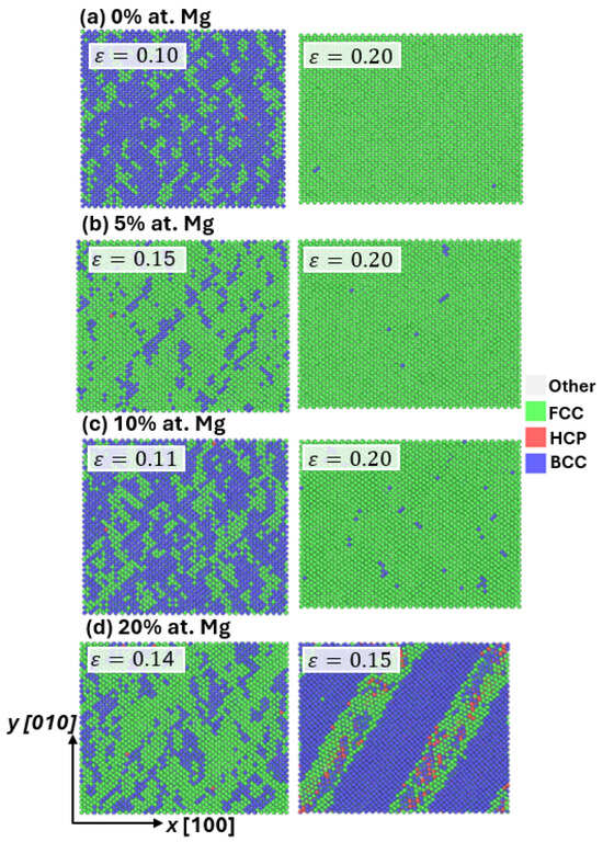 To gain insights into the deformation behavior of the samples, the Polyhedral Template Matching (PTM) algorithm [36] was employed to analyze the crystalline structure. Figure 5 shows the structural evolution of the samples at different strains during the tensile tests. The negative stress values observed in the stress–strain curves occur at 0.10 and 0.15 strains for the 0 at.% and 5 at.% Mg samples, respectively, indicating that the FCC phase is more stable than the BCC phase. Then, both samples undergo a complete phase transformation from the BCC to the FCC structure. The 10 at.% Mg alloy exhibits a similar transformation, but maintains positive stress values throughout the test. From these observations, Mg atoms act as stabilizers of the BCC structure. Interestingly, the 20 at.% Mg sample displays a different behavior: although part of the BCC lattice begins to transform into FCC, a shear-band–like deformation occurs abruptly at a strain of 0.145, interrupting the transformation process.