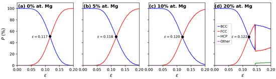 Quantification of the BCC and FCC structural populations was performed during the tensile tests, resulting in the curves shown in Figure 6. In all cases, the BCC population decreases as the sample undergoes deformation, while the FCC population rapidly increases, reflecting the phase transformation. For the 0 at.%, 5 at.%, and 10 at.% Mg samples, an almost complete transformation is observed, with the intersection of BCC and FCC populations occurring at similar strains. However, a different scenario is observed for the 20 at.% Mg sample. In this case, although a full BCC-to-FCC transformation initially occurs, a rapid reverse transformation from FCC to BCC is distinguished, accompanied by the formation of unidentified and HCP structures. This behavior corresponds to the formation of shear-band–like features observed in Figure 5d. The sudden reverse transformation is likely attributable to an artifact of the interatomic potential due to the abrupt change of populations.