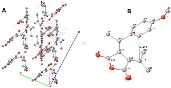 Figure 4B–F. The H···C and C···O contacts contribute an additional 10.9% and 7.1%, while C···C and O···O contacts together account for the remaining ~1%, indicating negligible contributions from these interactions. A substantial number of H···H contacts fall within the 2.2–3.5 Å range associated with strong to weak van der Waals attraction, making them the largest contributors to crystal stabilization. Numerous H···O and H···C contacts, occurring in the 2.5–2.8 Å and 2.6–3.0 Å ranges, respectively, also provide meaningful stabilizing contributions. Approximately 7.1% of the Hirshfeld surface arises from antiparallel approaches of the anhydride C=O bonds at distances around 4.0 Å, close to the neutral van der Waals separation for C···O. These contacts therefore generate only negligible—if any—repulsion between the succinic moieties in the crystal. All remaining contacts are too few in number or too long in distance to exert measurable intermolecular effects.