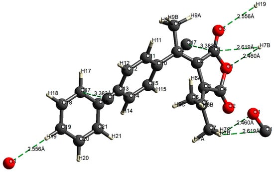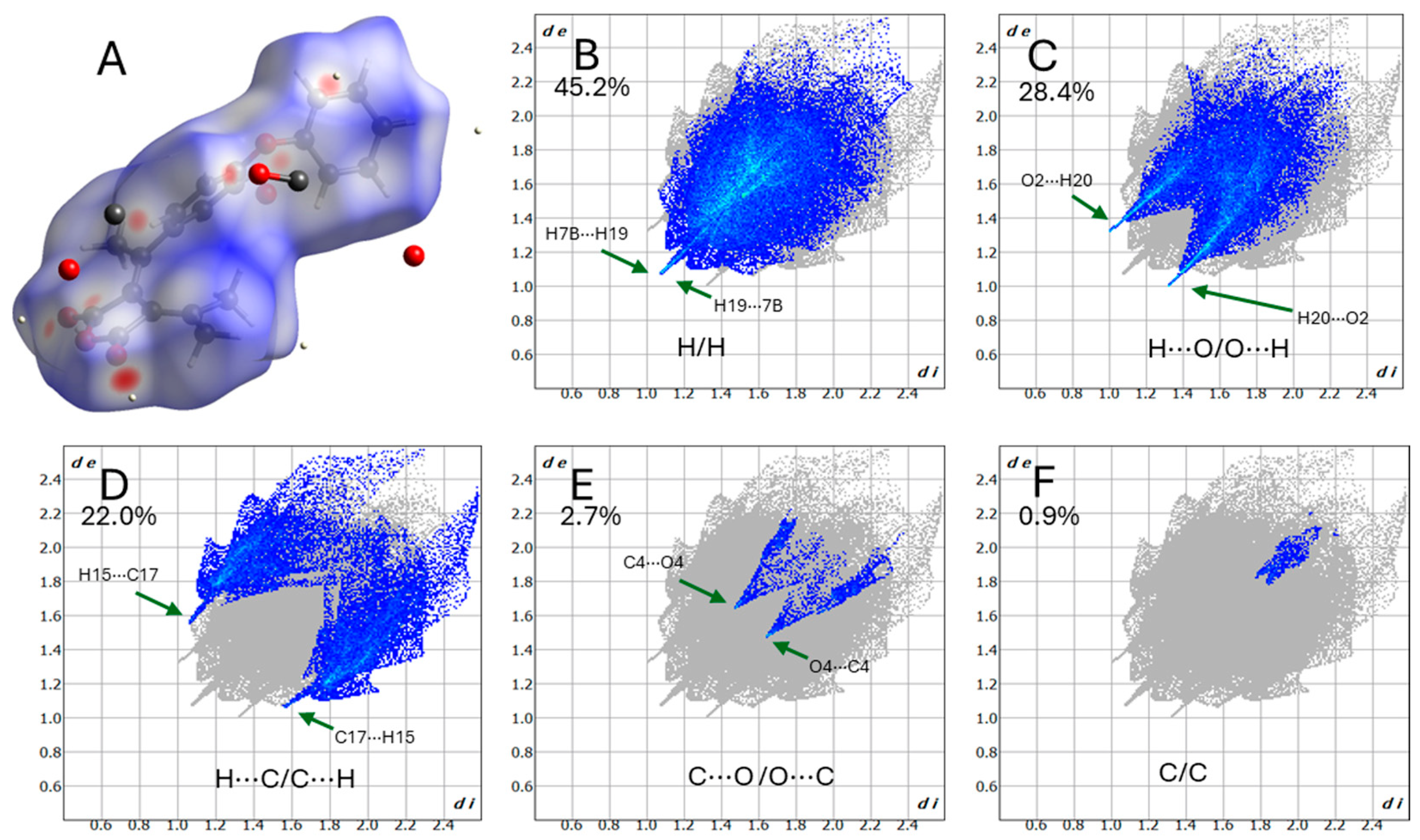 Figure 10A. Atoms and fragments outside the surface exhibit close contact with their corresponding counterparts inside the molecule. The total surface area is dominated by H···H, H···O, and H···C interactions, contributing 45.2%, 28.4%, and 22.0%, respectively, for a combined total of 95.6%. In contrast, C···O and C···C and O···O interactions contribute 2.7%, 0.9%, and 0.8%, respectively, accounting for the remainder of the surface area. Six pairs of reciprocal close contacts are identified as red spots on the surface, partially shown in
