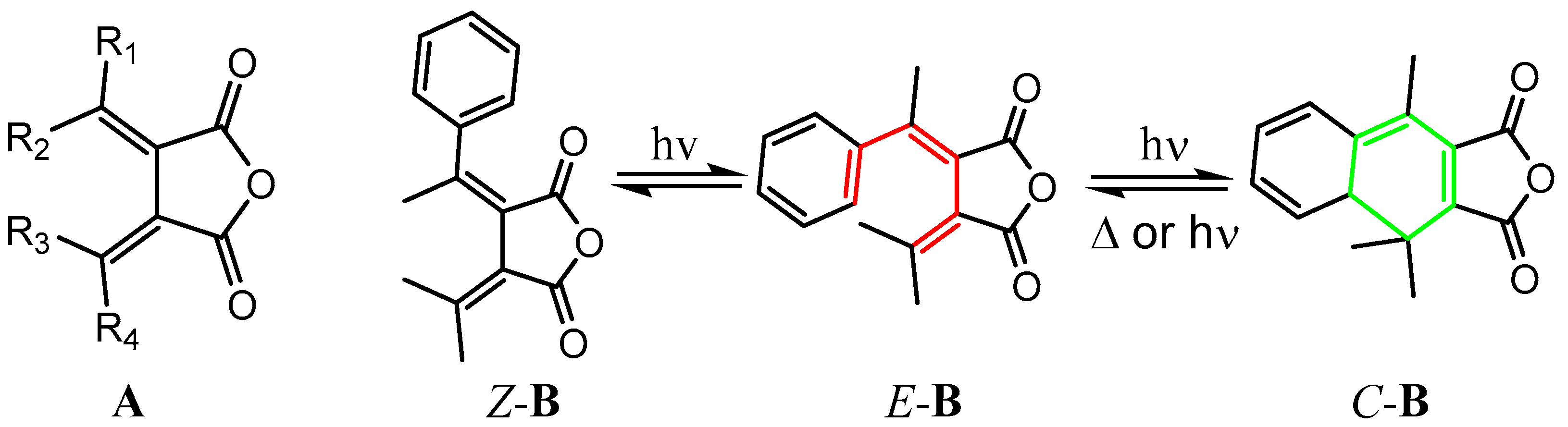 E form of fulgides exhibited a color change on wet thin-layer chromatography plates under a UV (365 nm) detector. The results of our early-stage study on photochromism are shown in