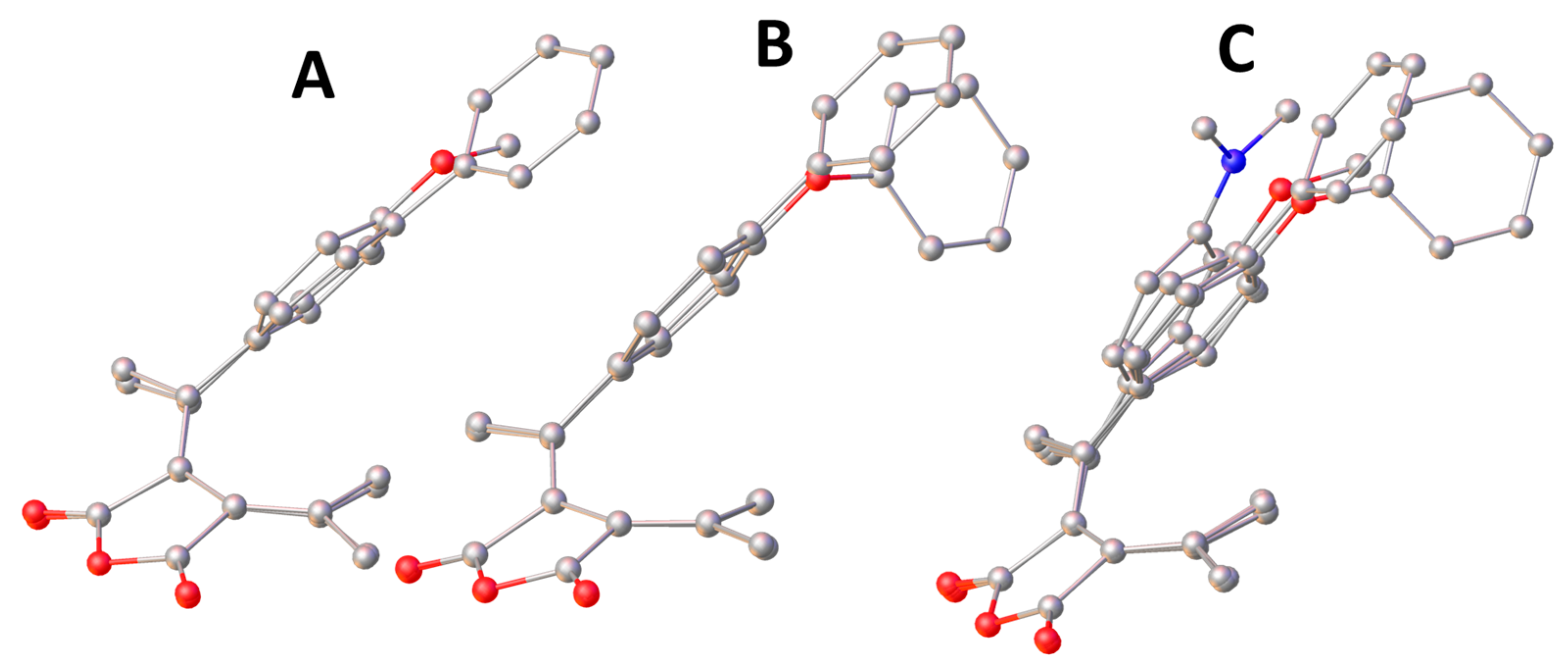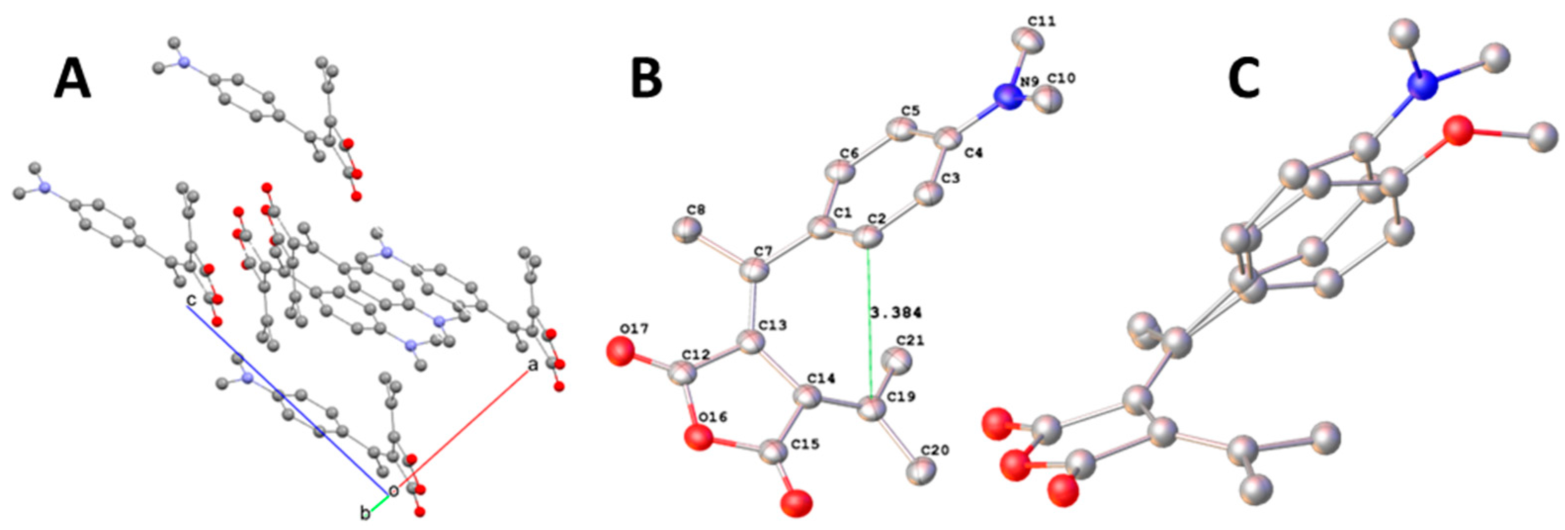 FPP, respectively, and these variations correlate well with rotation around the C10=C11 double bond, accompanied by the corresponding displacement of the C8 methyl group and the phenyl moiety. The abnormal separation of the dimethylamino group from the other three substituents is attributed to intermolecular repulsive close contacts between two hydrogen atoms of the corresponding methyl groups and the two oxygen atoms of the adjacent anhydride fragment, as revealed by the Hirshfeld surface analysis. The long distance between C2 and C14 in