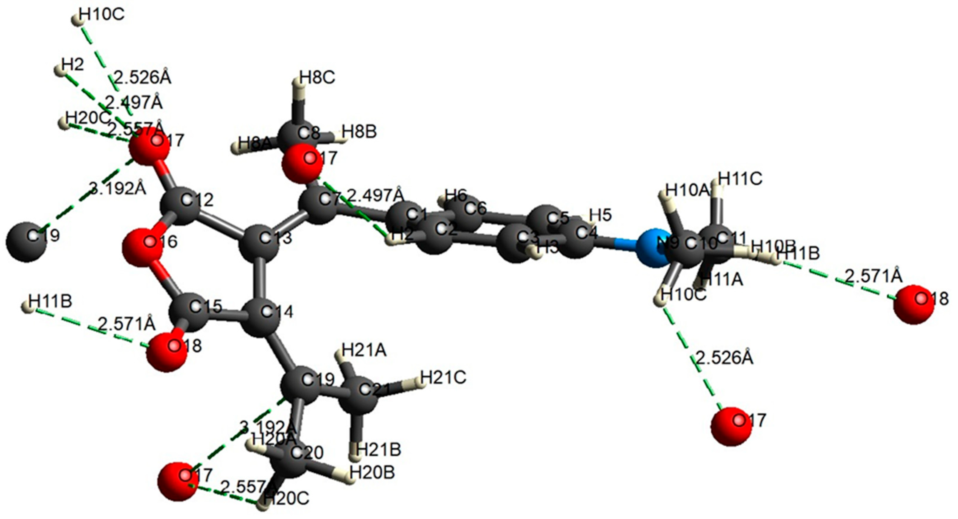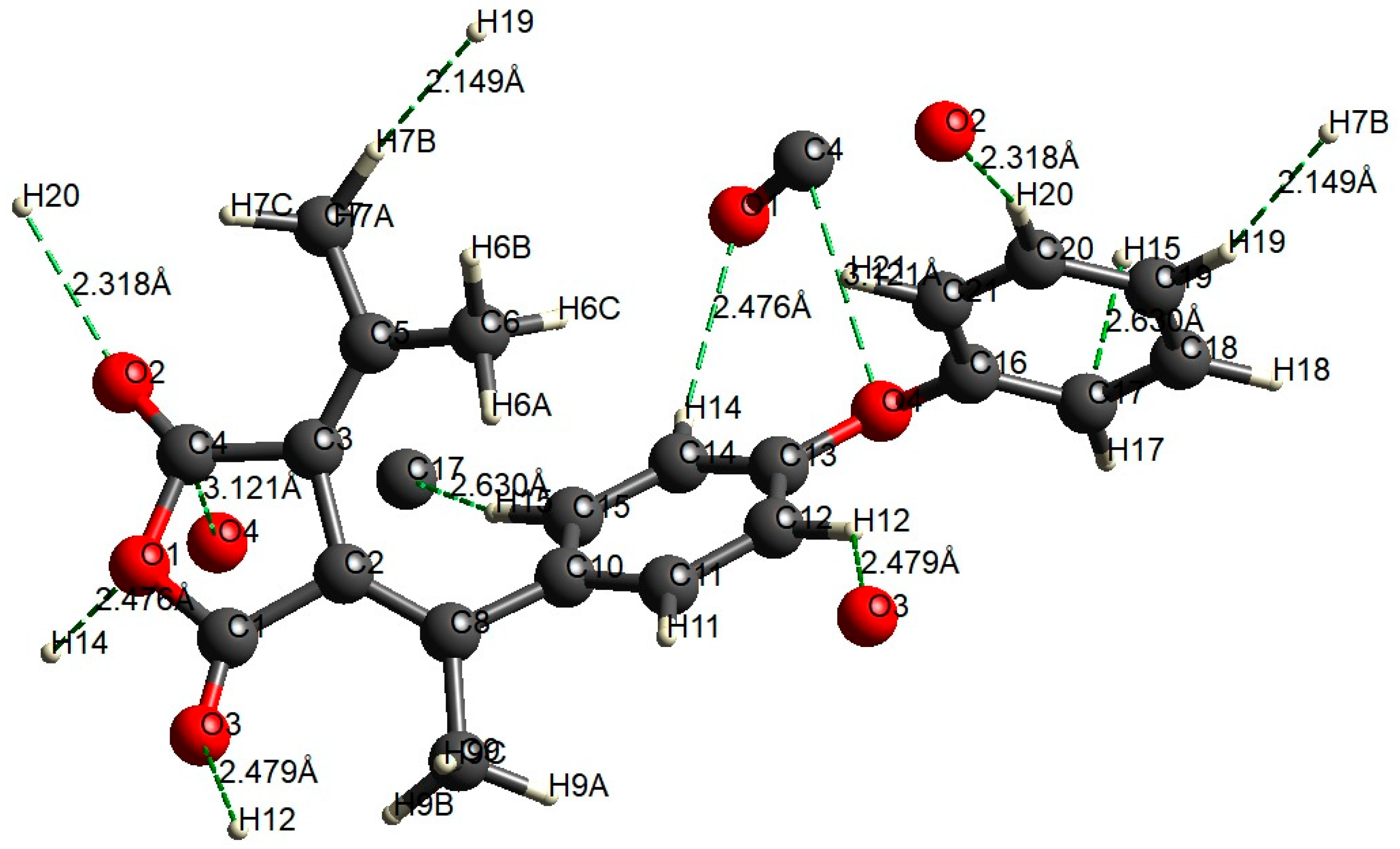 No repulsive H···H close contacts were observed. The reciprocal H19···O3 contacts have a distance of 2.556 Å, which is significantly shorter than the van der Waals limit of 2.8 Å. Together with the nearly linear C19–H19···O3 angle of 156°, these contacts are therefore best interpreted as weakly attractive. Four prominent red spots correspond to close approaches between H17B and the adjacent O1 and C1 atoms, which are directly bonded within the succinic moiety. The H17B···O1 and H17B···C1 contact distances are 2.460 and 2.619 Å, respectively, compared with neutral van der Waals separations of 2.72 and 2.80 Å. This suggests the contacts are strongly repulsive. Consequently, these interactions represent significant repulsion between the C17 methyl group and its intermolecularly adjacent succinic fragment.