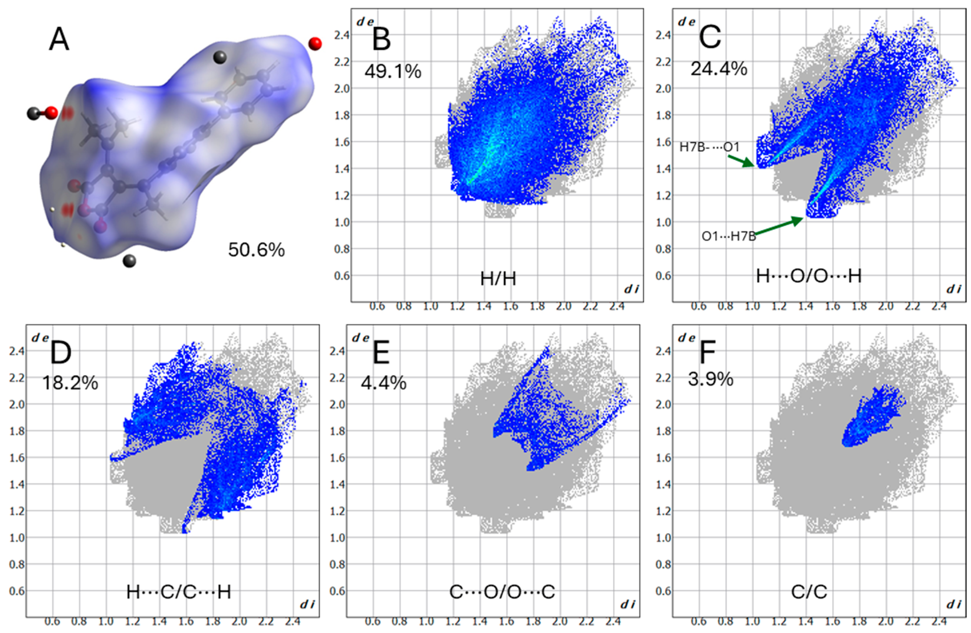 The analysis shows that H···H, H···O, and H···C contacts contribute 49.1%, 24.4%, and 18.2% of the total Hirshfeld surface area, respectively, together accounting for 91.7% of the surface. A measurable number of C···O and C···C contacts contribute an additional 4.4% and 3.9%, respectively, while the remaining fraction arises from other minor interactions. Crystal stabilization is dominated by the large number of H···H contacts within the van der Waals attraction range, with smaller but notable contributions from C···O and C···C contacts. Five reciprocal close contacts are indicated by red spots on the Hirshfeld surface, shown partially in