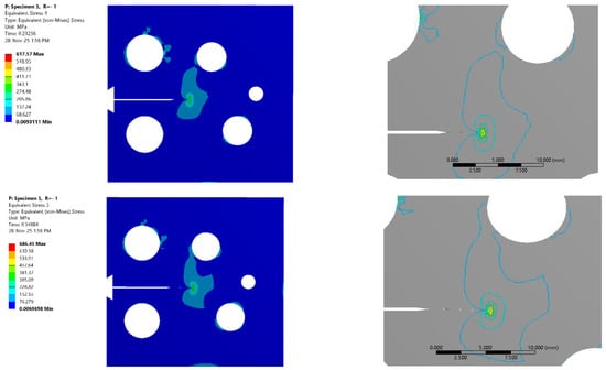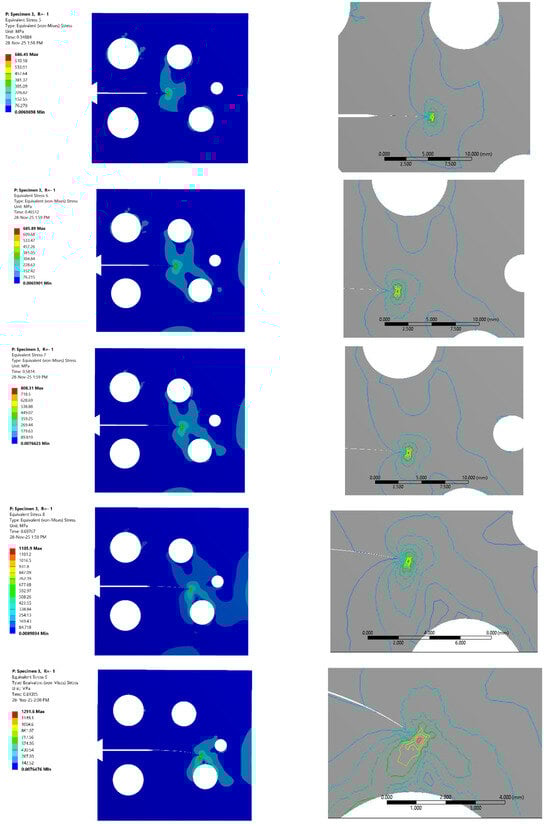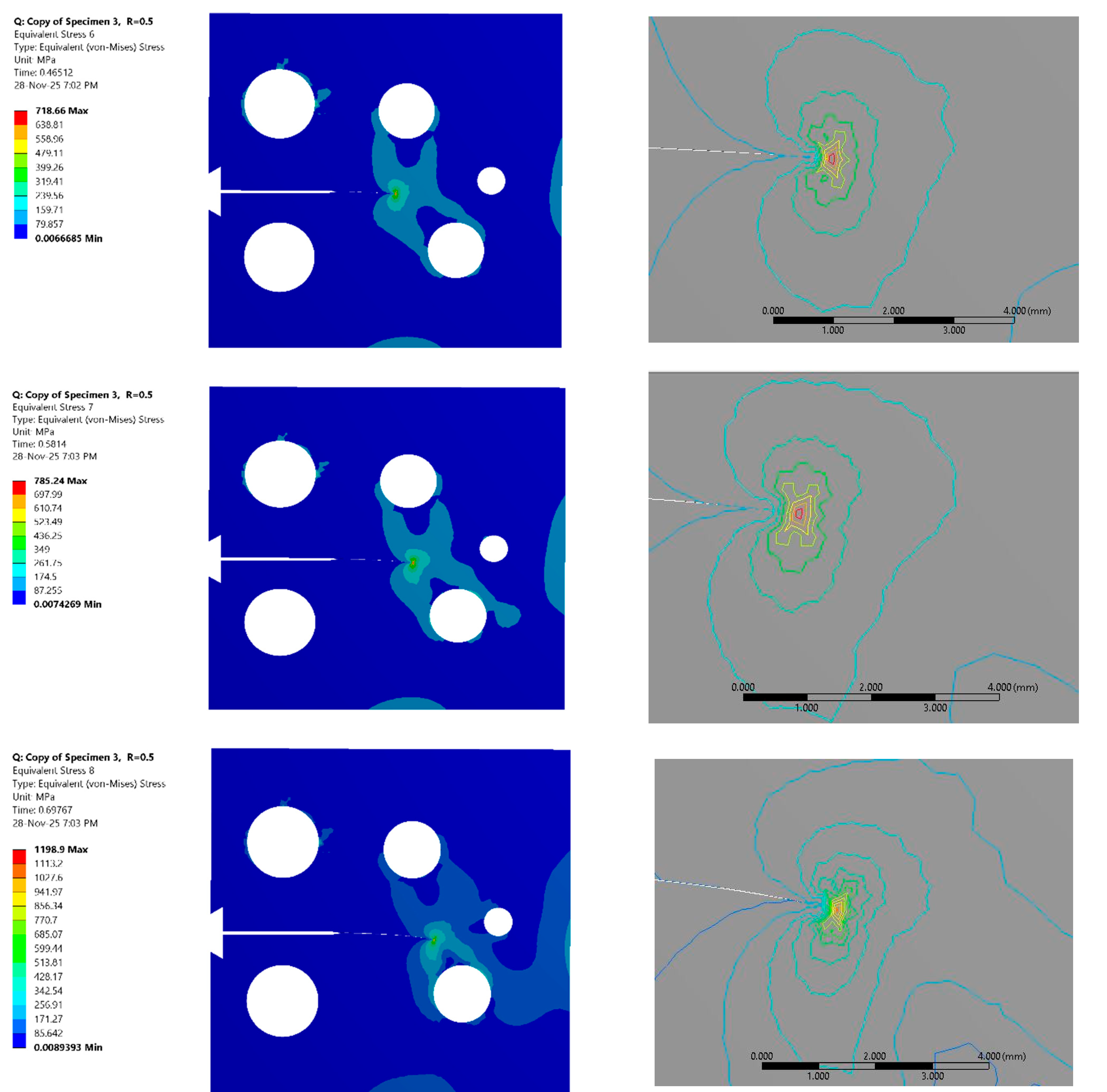 Figure 6 illustrate the crack tip stress state during crack growth, specifically showing the von Mises stress distribution for eight selected steps, covering stress ratios of 0.5 and −1. The color maps vividly illustrate the intensity of the stress singularity, while the iso-line contour distributions provide a critical qualitative boundary of the yielding region. These iso-contours demarcate the shape and extent of the plastic zone, revealing the characteristic bi-lobed “butterfly” shape associated with plane stress conditions in fracture mechanics. As the crack propagates, the evolution of these contours visually confirms the progressive expansion of the damage zone ahead of the crack tip. A comparison of the stress maps between the two loading conditions visually suggests a more extensive region of high stress and yielding in the fully reversed cases compared to the tensile–tensile cases. The qualitative observations from