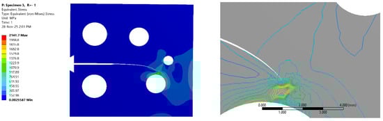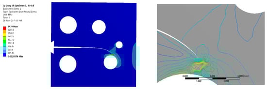 Specimen 2 demonstrates excellent repeatability with Specimen 1, validating the numerical methodology and the consistency of the material properties. However, Specimen 3 exhibits a significantly extended fatigue life, approximately 28% longer for R = 0.5 and 34% longer for R = −1 and a larger final crack length before final fracture. This discrepancy strongly suggests that the specific initial crack configuration of Specimen 3 (H = 23.2 mm) induced a unique interaction between the propagating crack and the specimen’s geometric features. The three additional holes in the modified CT specimen create a complex, non-uniform stress field. The curvilinear crack path originating from the H = 23.2 mm position appears to have navigated this stress field more favorably than the paths in the other two specimens. The specific trajectory of the crack in Specimen 3 may have experienced a more pronounced “crack shielding” effect from the compressive stress fields surrounding the nearby holes. This would effectively lower the stress intensity factor at the crack tip, retard the crack growth rate, and extend the fatigue life. The larger final crack length in Specimen 3 suggests a potentially larger initial ligament or a slightly thicker specimen, which would increase the resistance to final fracture.