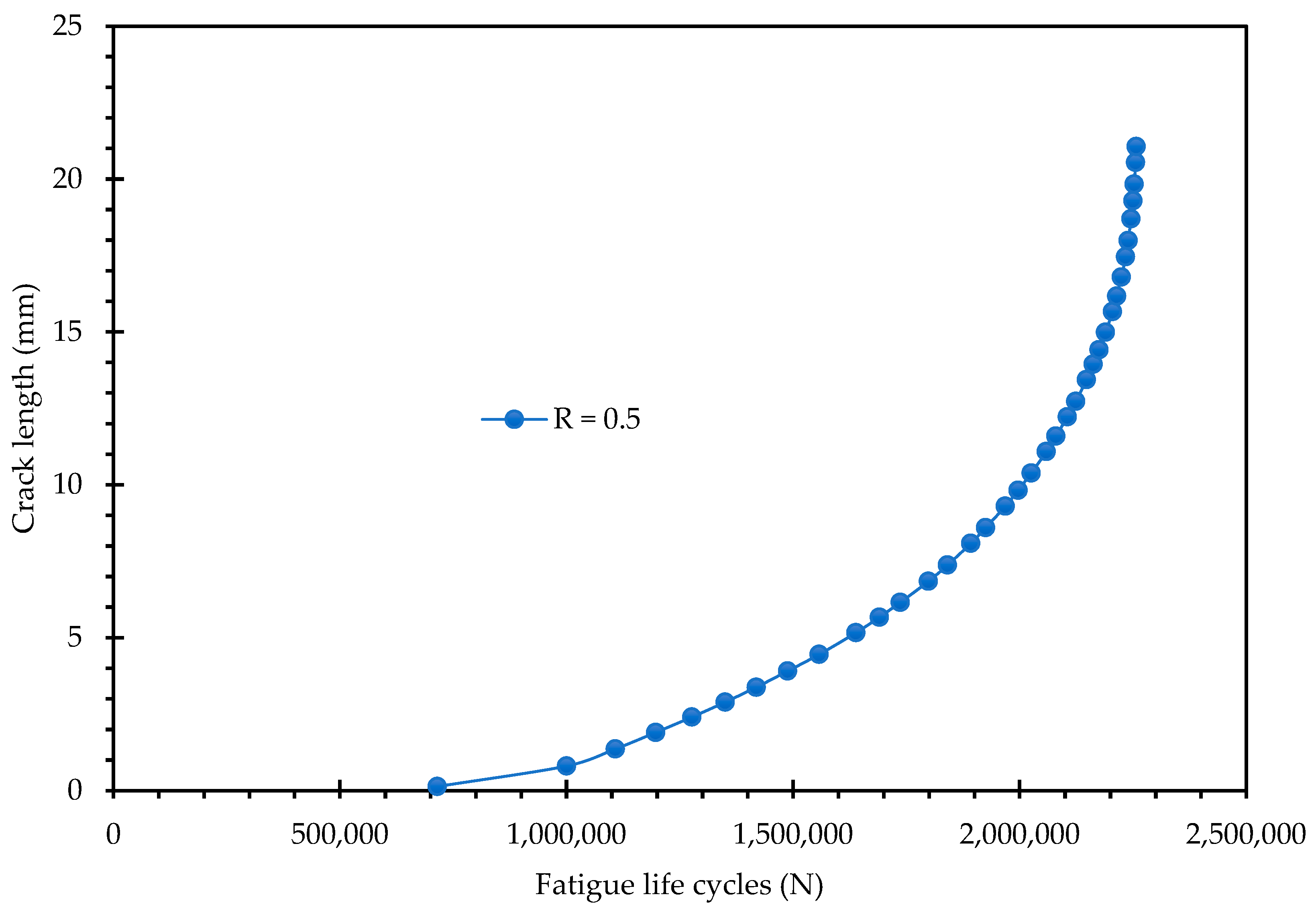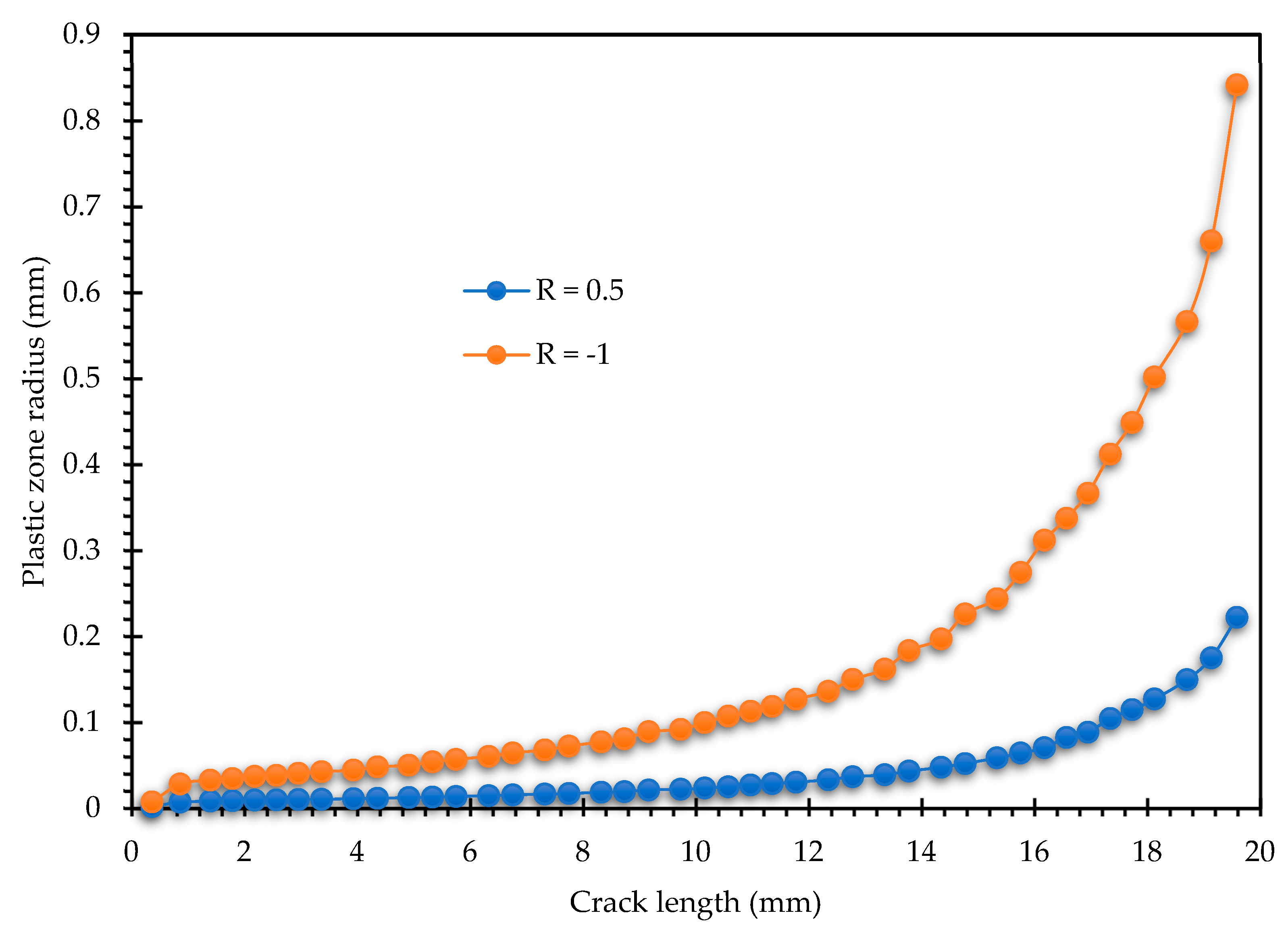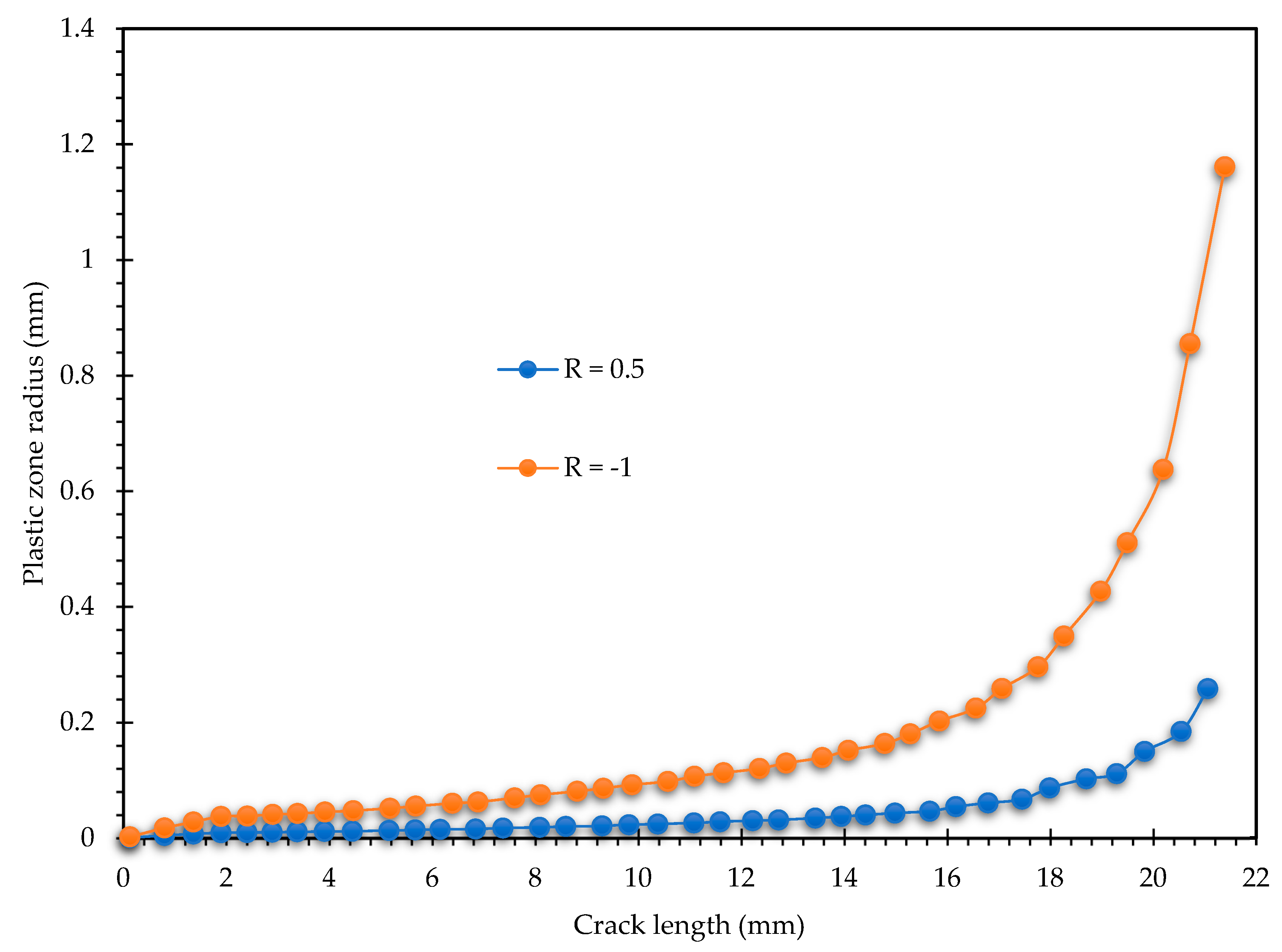 Figure 6. The condition that generated the larger plastic zone (R = −1) corresponds to the significantly shorter fatigue life. This confirms that the expanded plastic zone observed in the fully reversed loading is not merely a shielding mechanism (crack closure) but rather a region of intense cyclic damage. The reversed yielding inherent to the R = −1 cycle accelerates the accumulation of fatigue damage ahead of the crack tip, leading to faster crack propagation rates and a reduction in total life by an order of magnitude compared to the R = 0.5 condition. Conversely, the smaller plastic zone in the R = 0.5 case indicates less localized damage accumulation per cycle, allowing the material to sustain the load for nearly 1.8 million cycles.