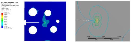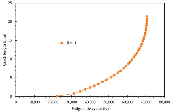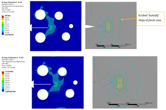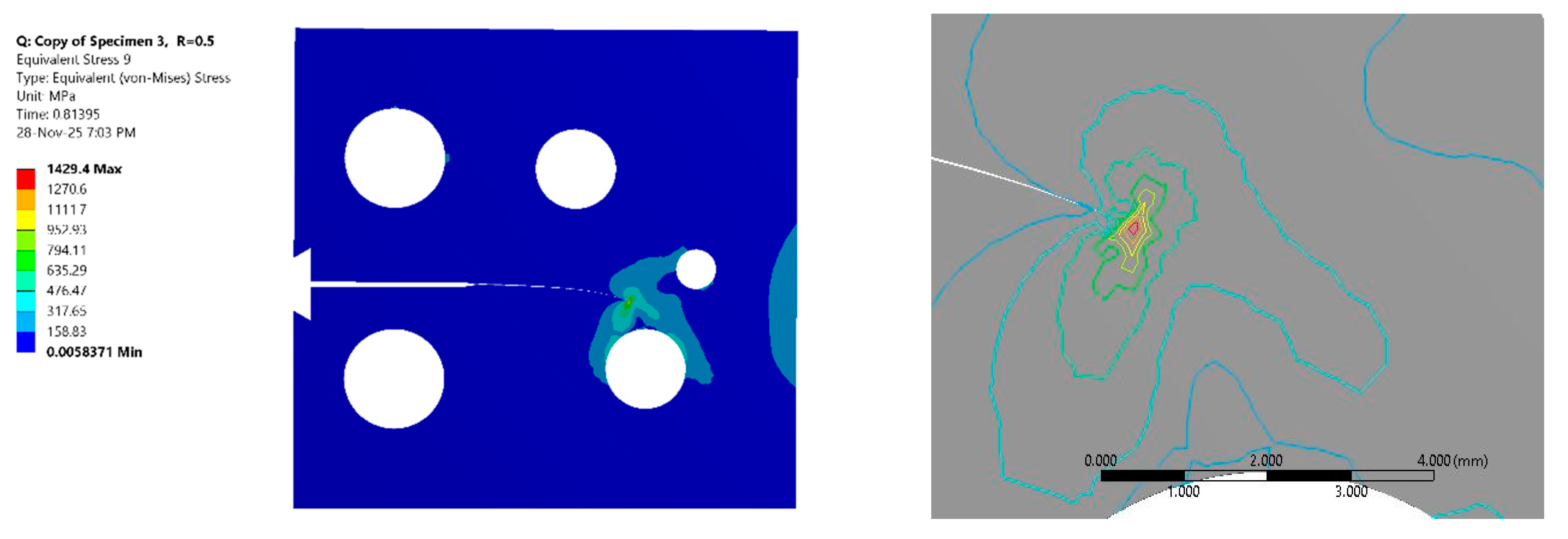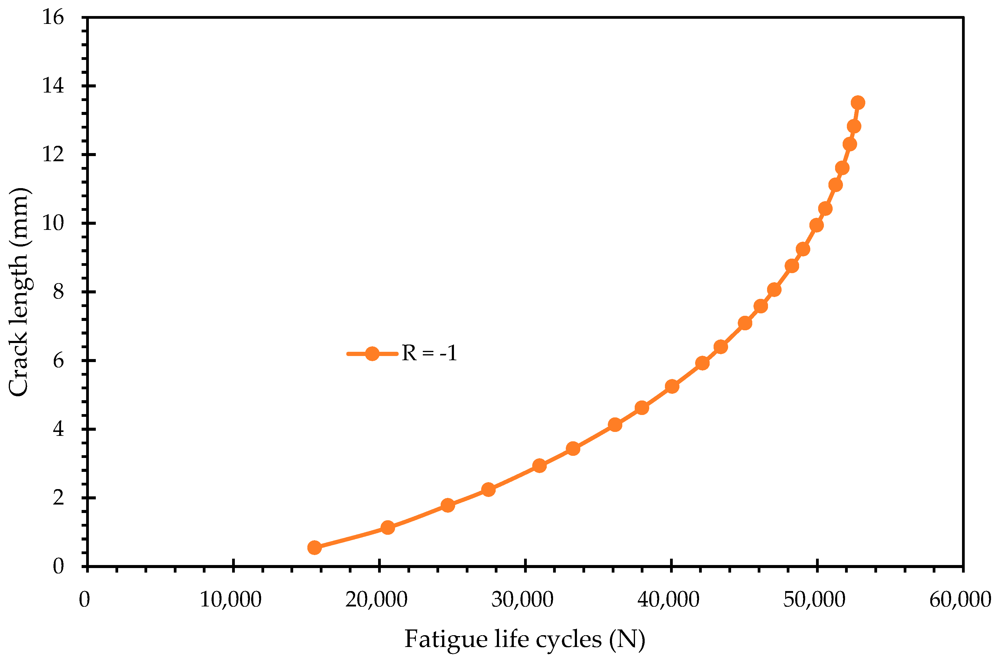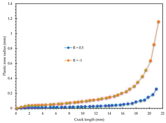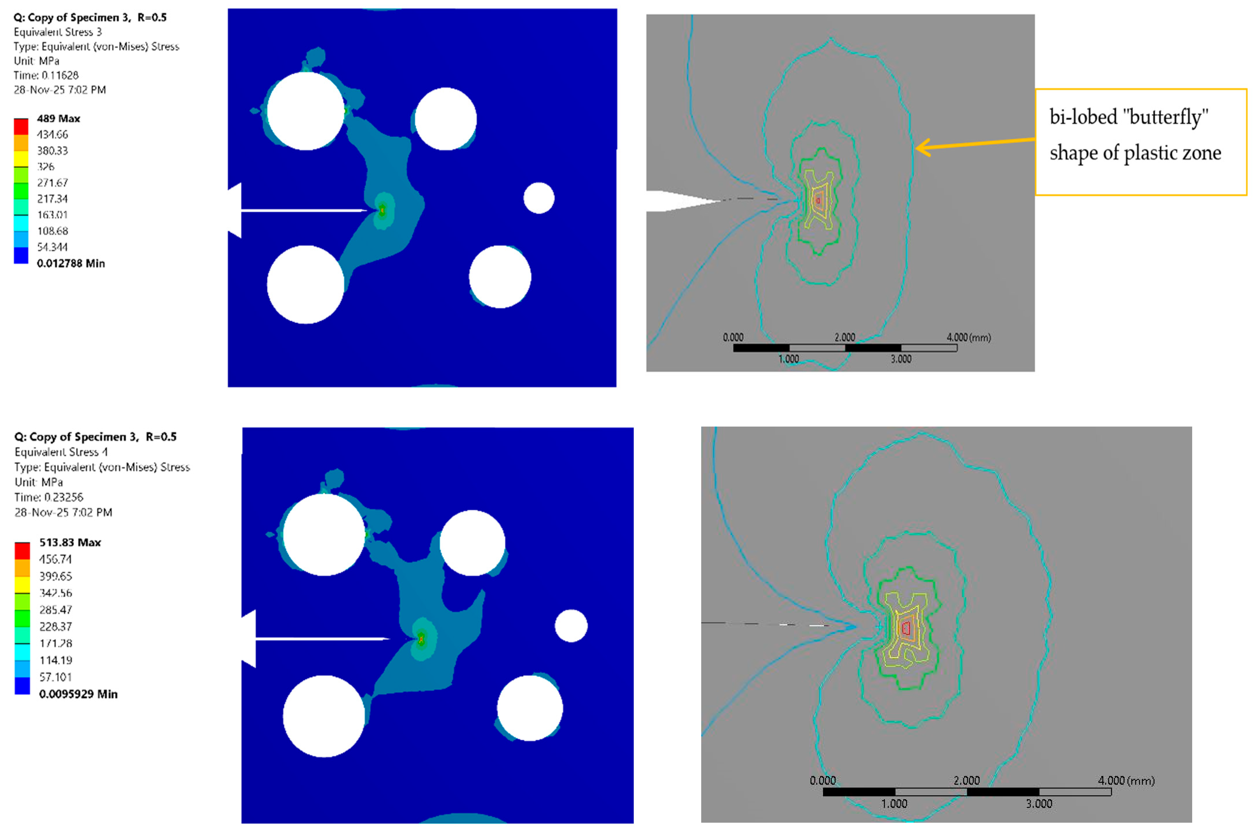 Figure 6. The condition that generated the larger plastic zone (R = −1) corresponds to the significantly shorter fatigue life. This confirms that the expanded plastic zone observed in the fully reversed loading is not merely a shielding mechanism (crack closure) but rather a region of intense cyclic damage. The reversed yielding inherent to the R = −1 cycle accelerates the accumulation of fatigue damage ahead of the crack tip, leading to faster crack propagation rates and a reduction in total life by an order of magnitude compared to the R = 0.5 condition. Conversely, the smaller plastic zone in the R = 0.5 case indicates less localized damage accumulation per cycle, allowing the material to sustain the load for nearly 1.8 million cycles.