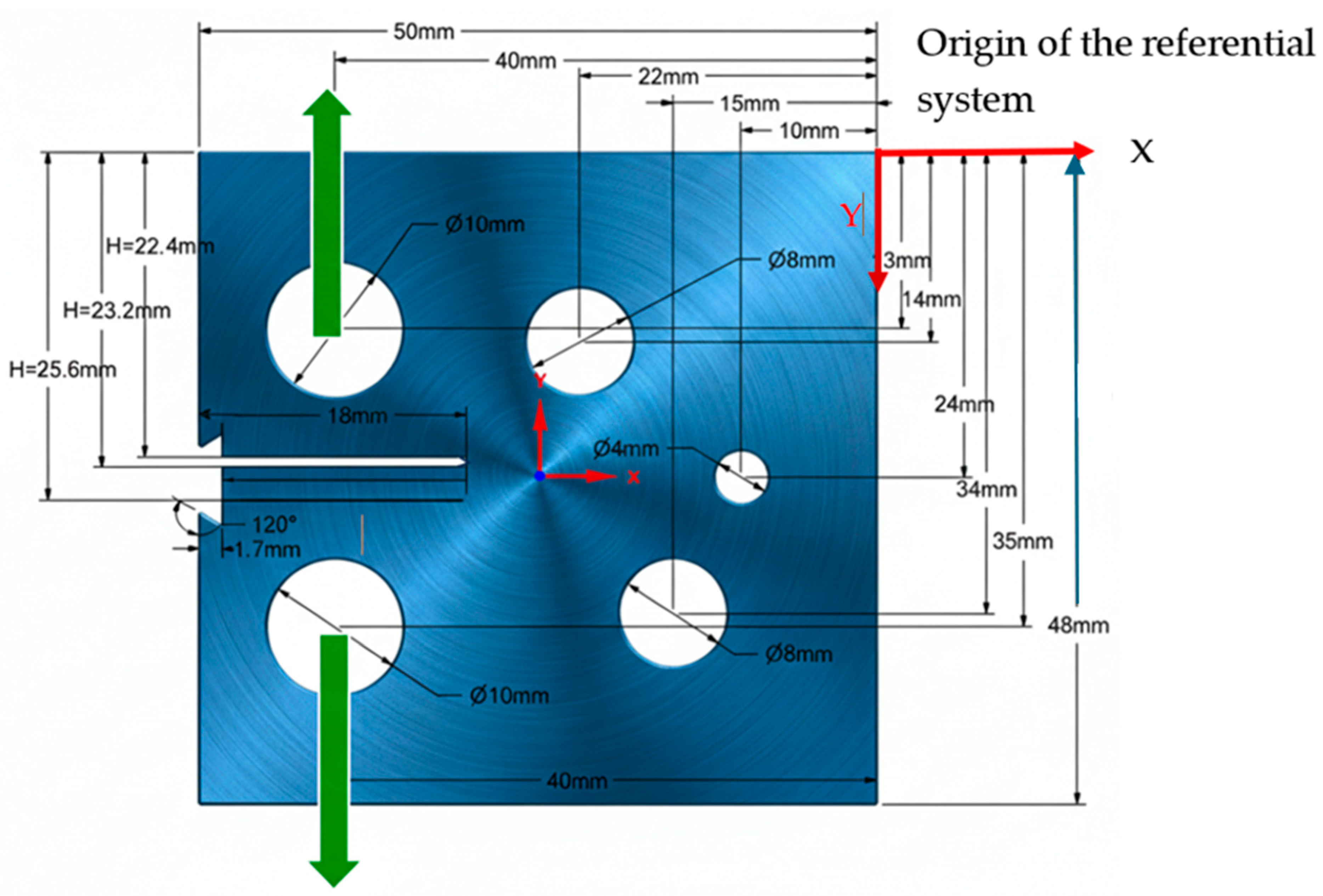 Figure 1. This modified design differs from standard specimens by incorporating three extra holes, which break the normal symmetry and compel the fatigue cracks to follow curvilinear pathways. The numerical simulation was conducted using a Haynes 230 nickel-based superalloy defined by an elasticity modulus 211 GPa and a Poisson’s ratio of 0.3 under plane stress condition. The material displays a yield strength of 422 MPa and an ultimate strength of 838 MPa. Furthermore, the fatigue crack growth is governed by Paris’ law constants at room temperature, utilizing a coefficient (