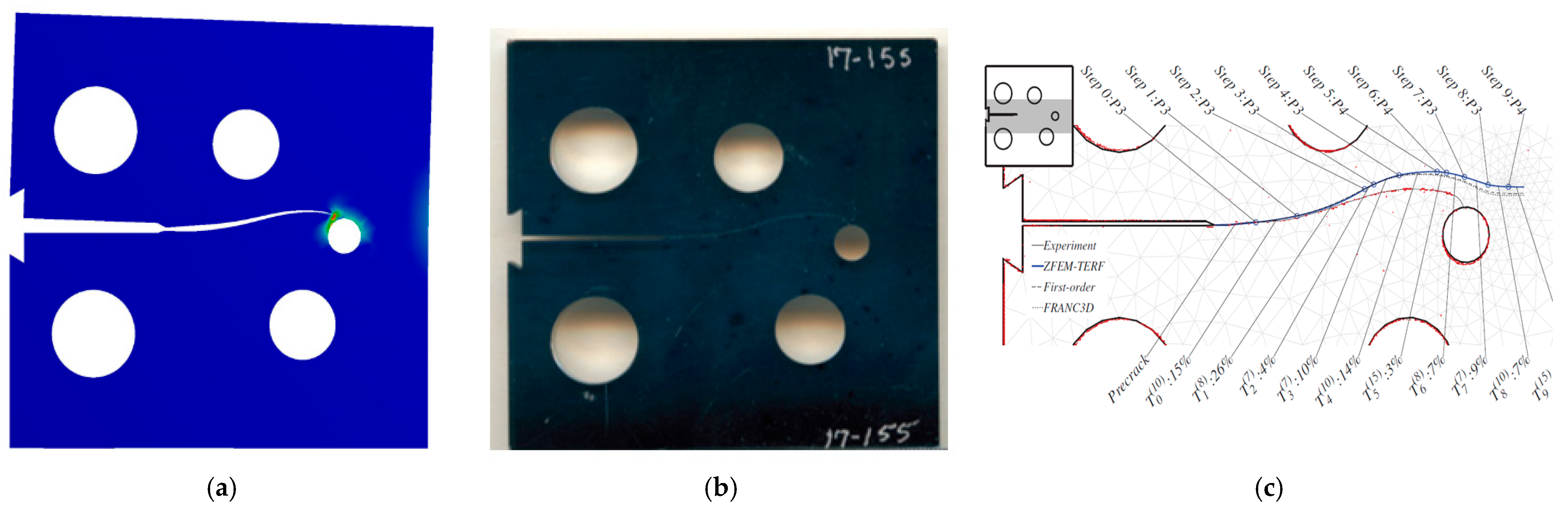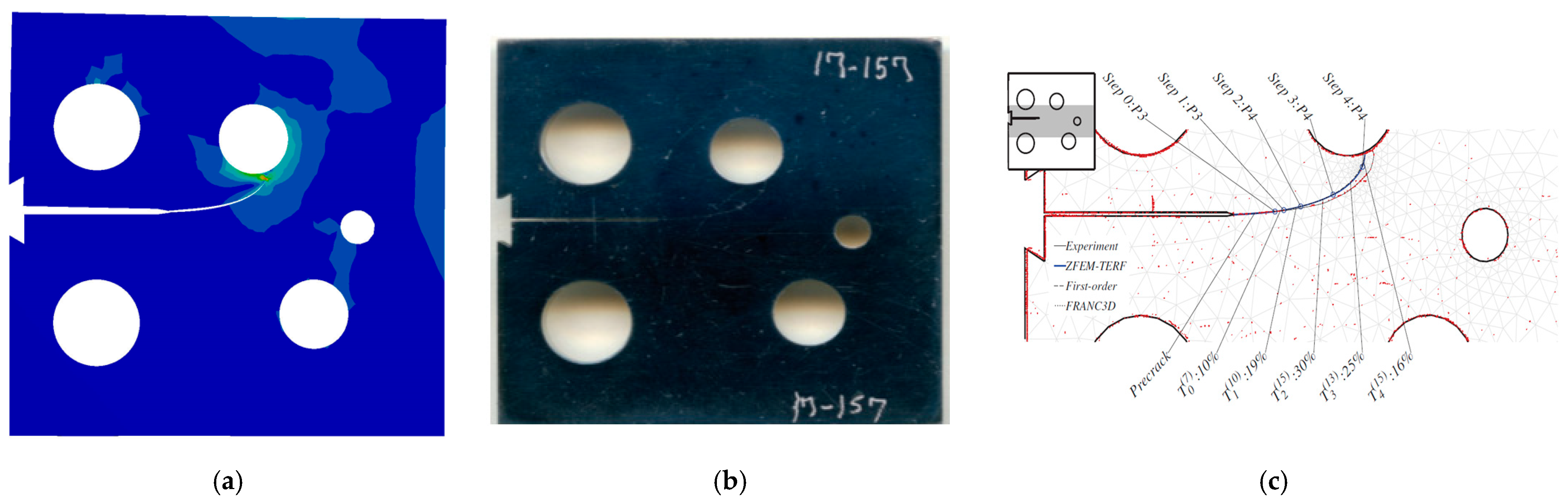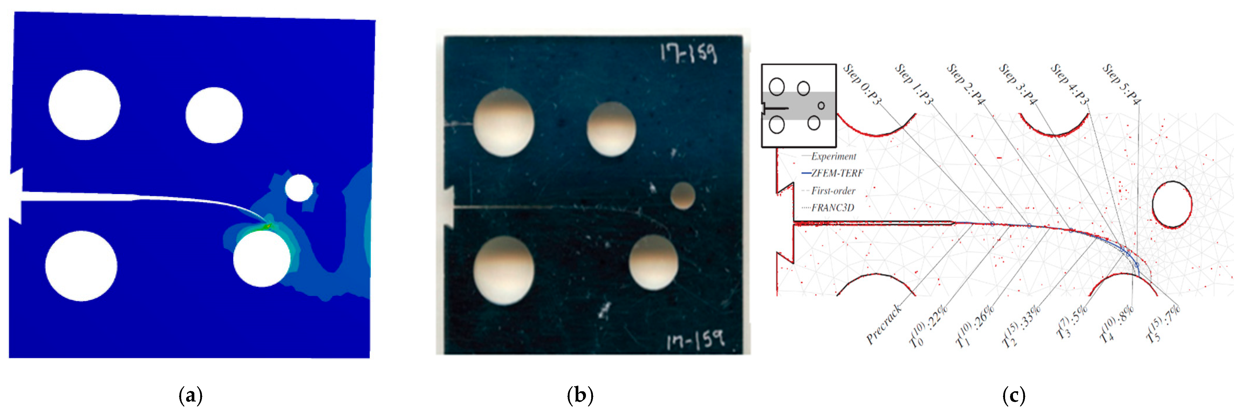 Figure 3a–c presents a comparison between the crack propagation path simulated in this study (using ANSYS Workbench 19.2), the experimental and numerical data derived from Wagner [