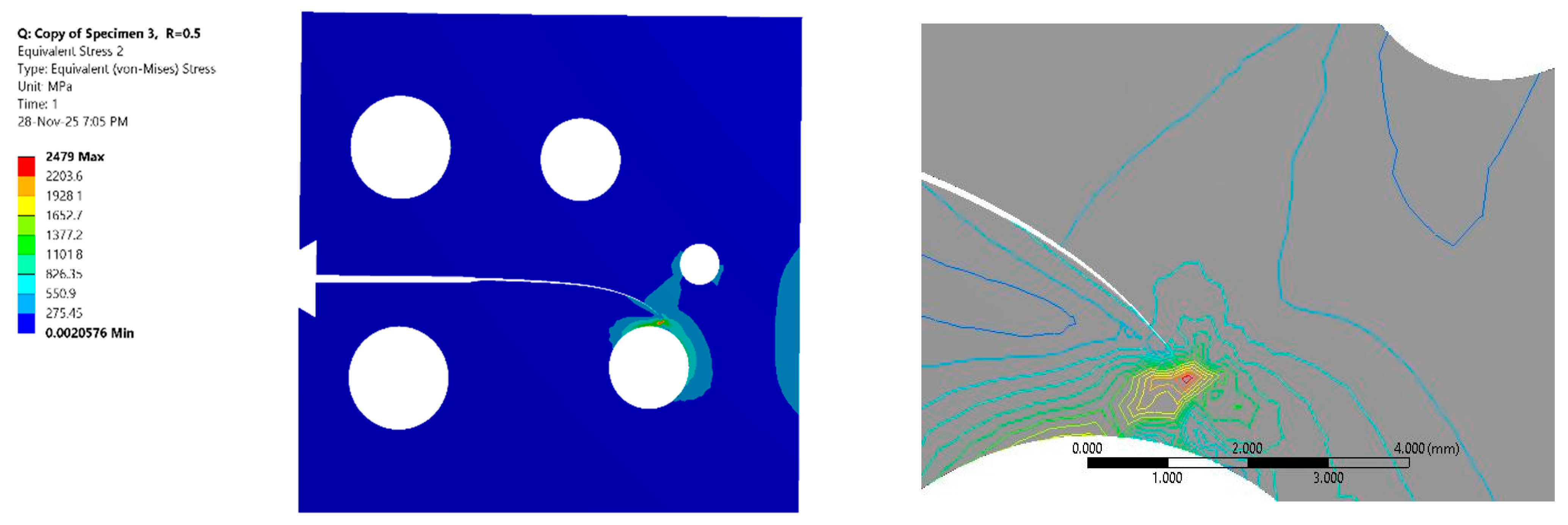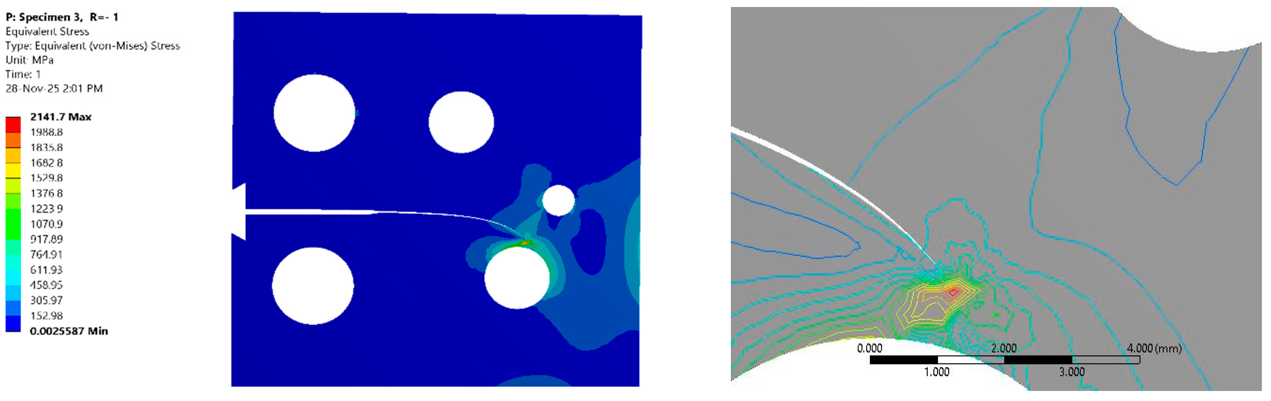 Figure 15 collectively reinforces the critical and dominant role of the stress ratio in determining fatigue performance, while simultaneously providing a quantitative measure of the inherent scatter and specimen sensitivity in fatigue testing. The overall finding remains robust: the fully reversed loading drastically reduces fatigue life, a phenomenon directly linked to the increased plasticity and SSY violation observed in the plastic zone analysis for this condition. The observed scatter in Specimen 3 highlights the necessity of conducting multiple tests to ensure the reliability of fatigue life predictions. Although the ANSYS SMART framework is robust for simulating crack growth, it is important to clarify that its standard implementation does not incorporate the discrete contact and friction effects associated with crack closure under compressive loading.
