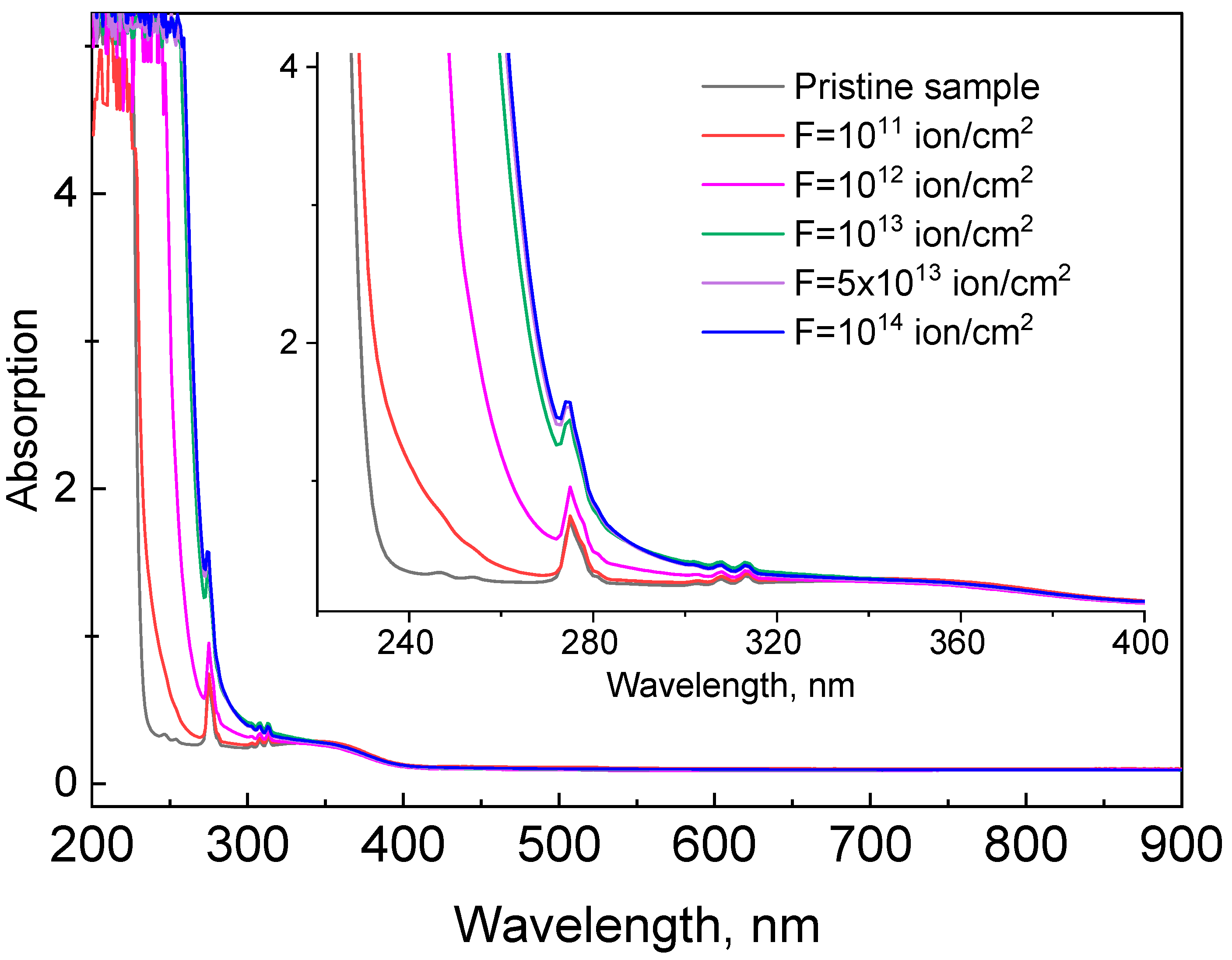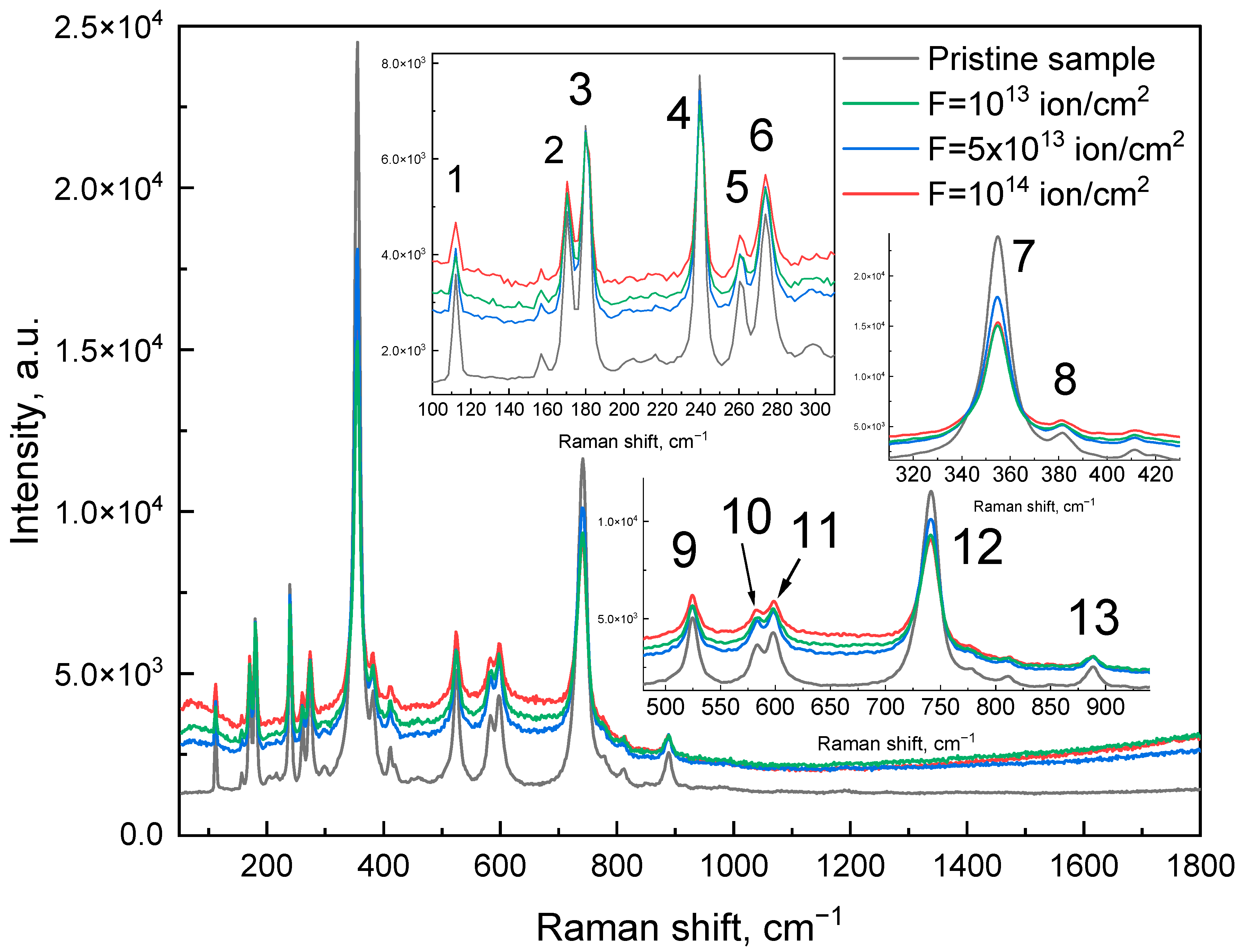 | Pristine Sample | F = 1013 ion/cm2 | F = 5 × 1013 ion/cm2 | F = 1014 ion/cm2 | ||||||||||
