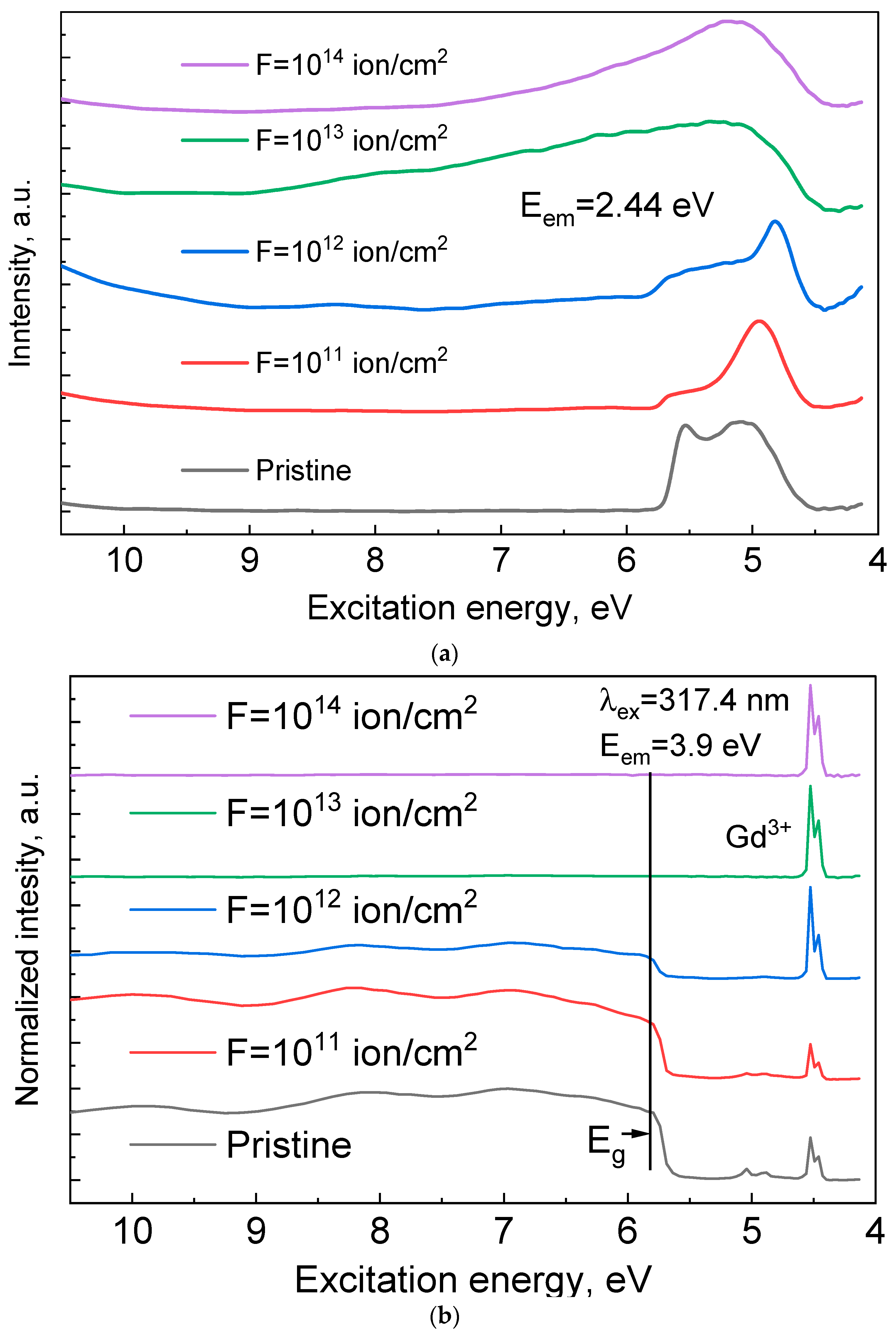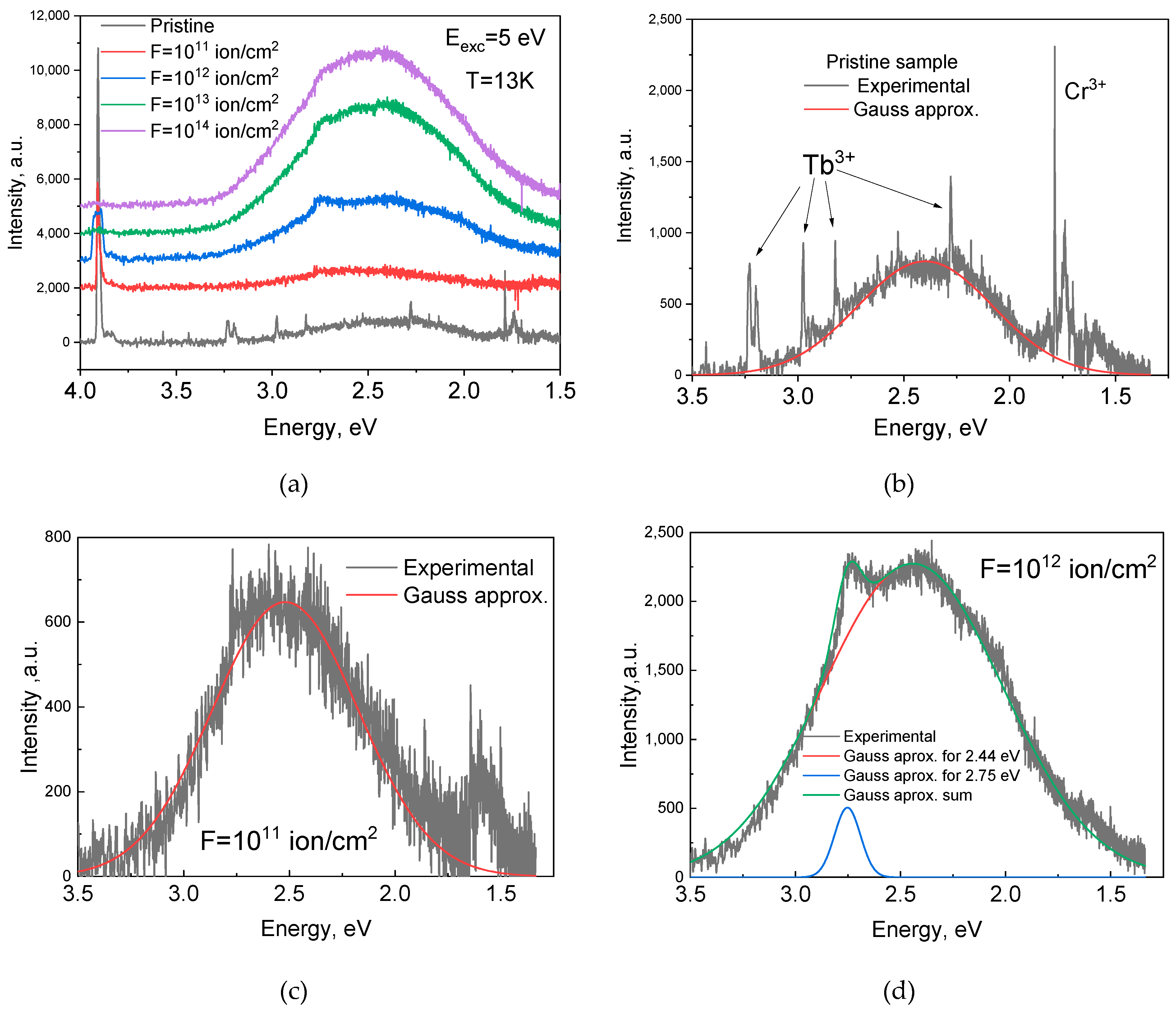 - Pankratova, V.; Butikova, J.; Kotlov, A.; Popov, A.I.; Pankratov, V. Influence of swift heavy ions irradiation on optical and luminescence properties of Y3Al5O12 single crystals. Opt. Mater. X 2024, 23, 100341. [Google Scholar] [CrossRef]