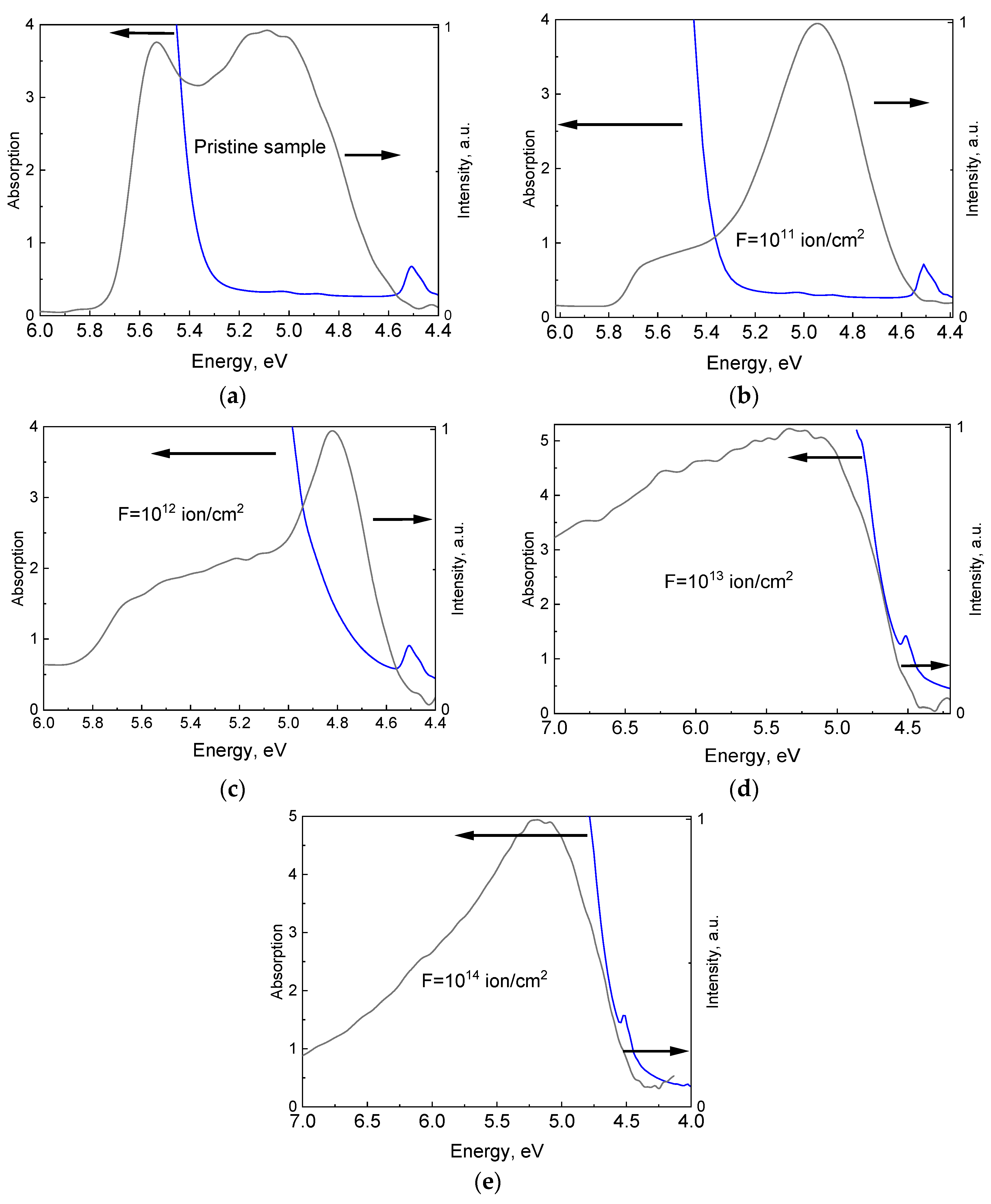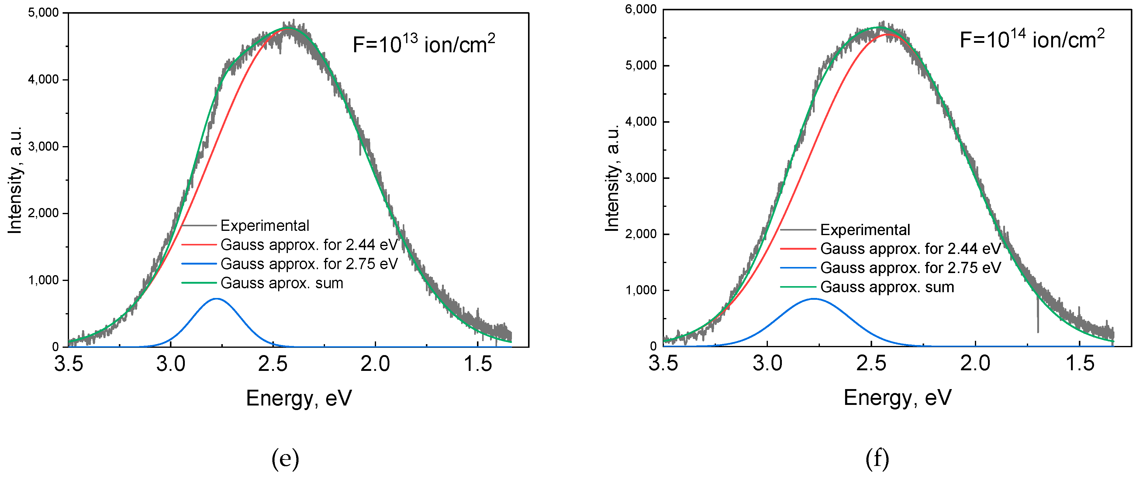 | Fluence, ion/cm2 | E1, eV | ΔE, eV | E2, eV | ΔE, eV |