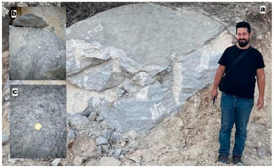 Field (a) and close-up (The 50 Turkish kuruş coin was used as the scale) (b,c) views of dark grayish-blue marble (BC-1), southern Çiçekdağı.