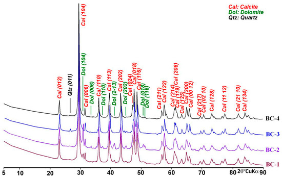 XRD analyses revealed that the white sample (BC-4) consists entirely of pure calcite; the grayish-blue samples (BC-1 and BC-2) contain a calcite–dolomite assemblage; and the blue sample (BC-3) includes a calcite–quartz assemblage. These mineralogical distinctions are consistent with the chemical compositional variations determined by XRF and ICP-MS analyses.