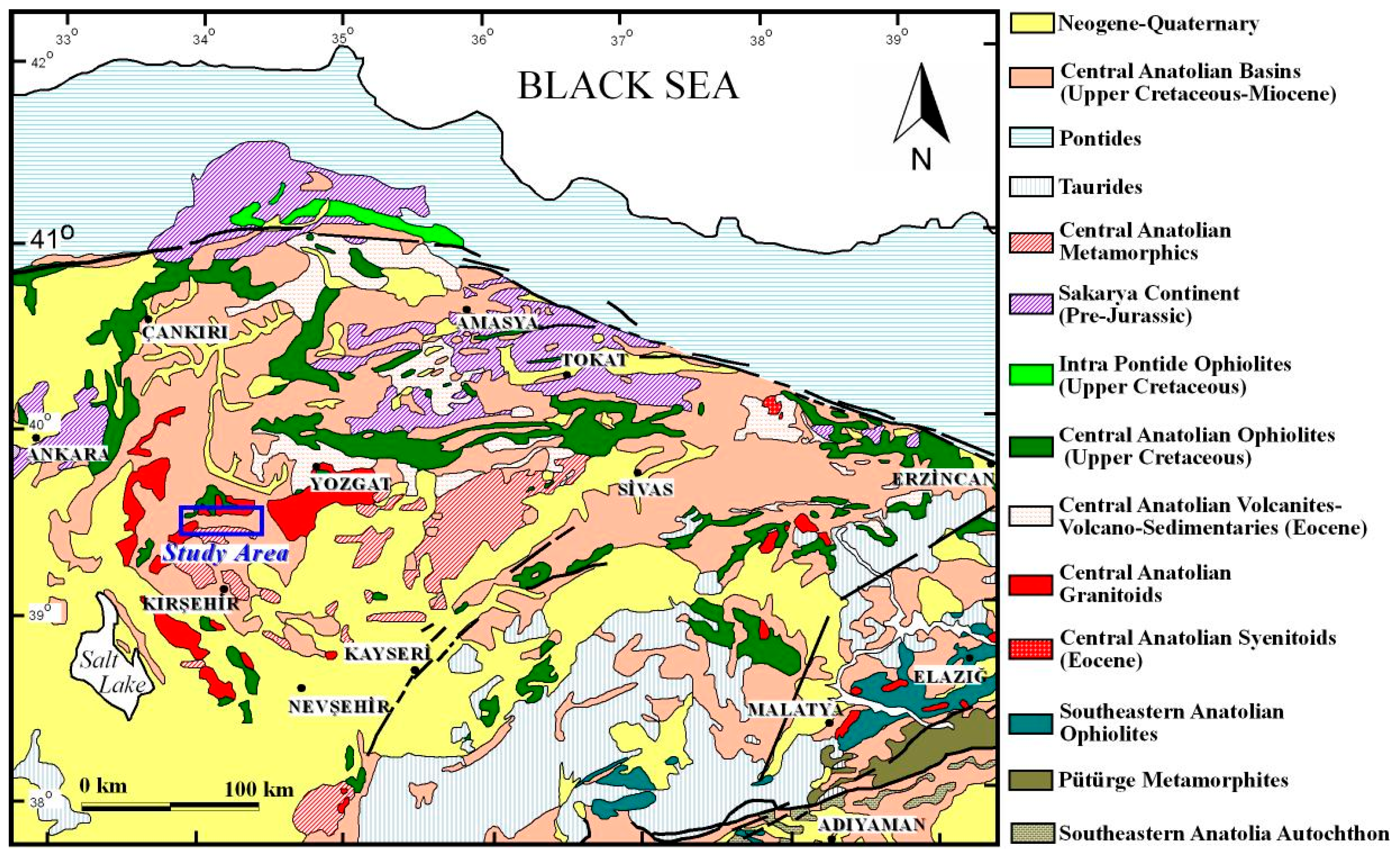 - Bingöl, E. 1:2,000,000 Scale Geological Map of Turkey; Mineral Research and Exploration Publication: Ankara, Turkey, 1989. [Google Scholar]