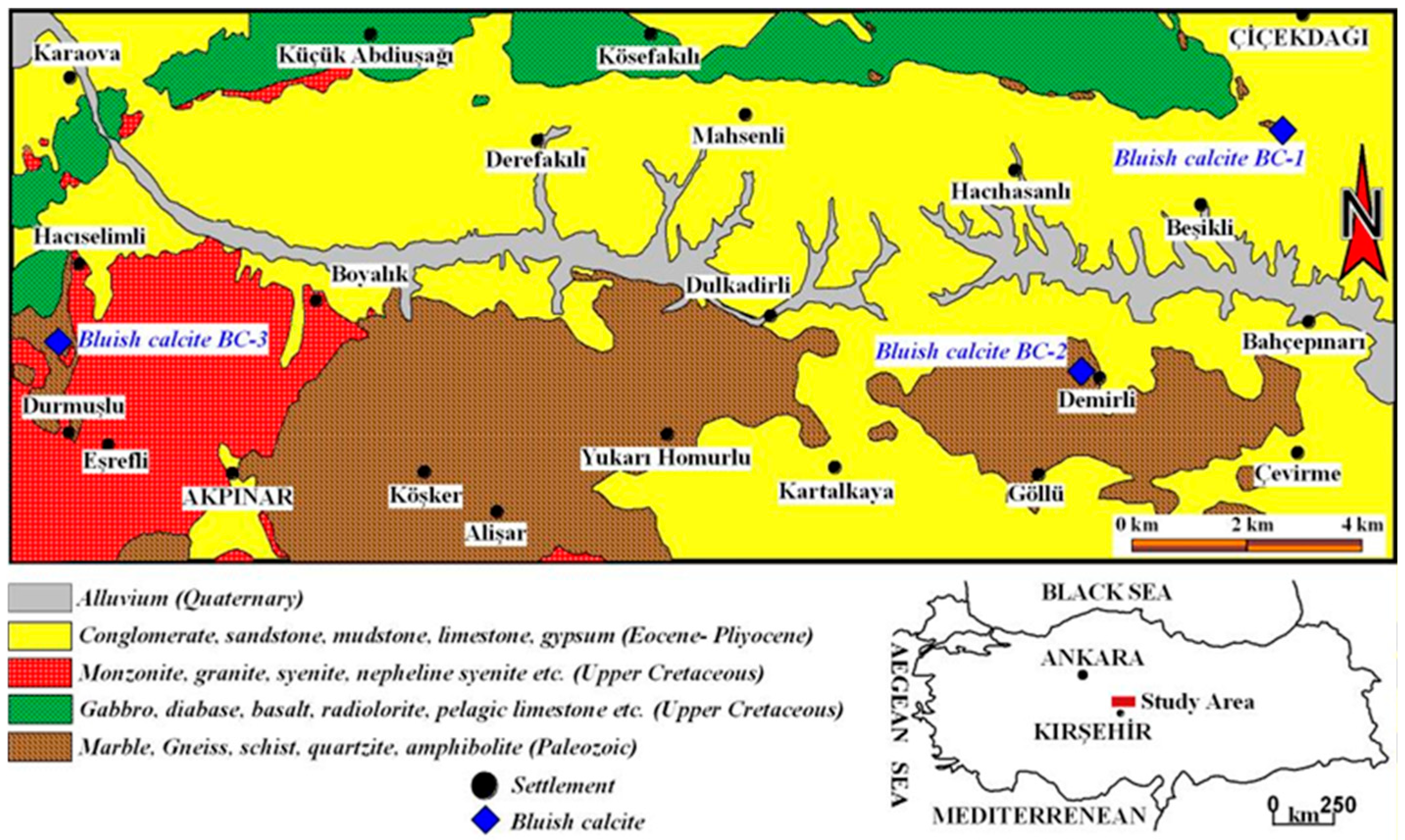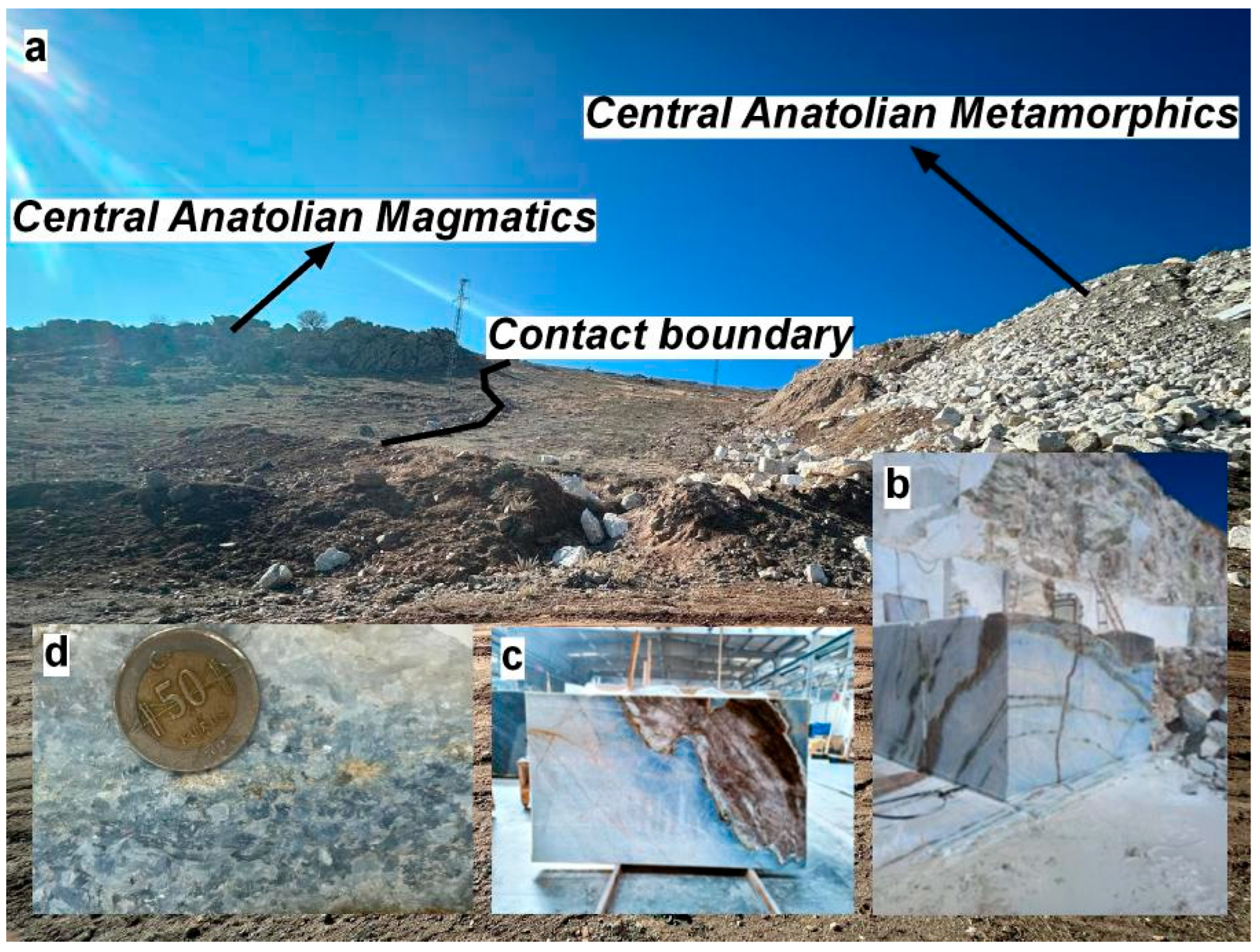 - Ekincioğlu, G.; Başıbüyük, Z.; Ekdur, E.; Ballı, F.; ve Kanbir, E.S. Kırşehir Doğal Taş Sektörü Analizi ve Yatırım Fırsatları Raporu; Kırşehir Sanayi ve Ticaret Odası: Kırşehir, Türkiye, 2014. Available online: https://ahika.gov.tr/assets/ilgilidosyalar/Kirsehir-Dogal-Tas-Sektor-Analizi-ve-Yatirim-Imkanlari-Raporu.pdf (accessed on 1 January 2026). (In Turkish)
