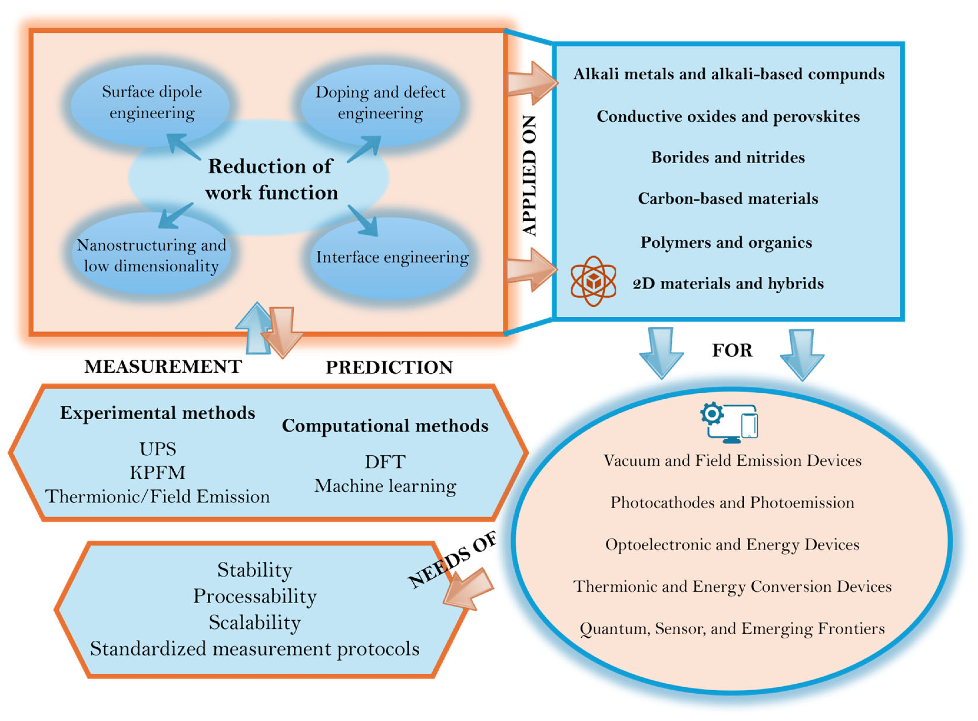 - Scalability and uniformity: Scaling from small-area laboratory samples to device-scale (cm2 or more) introduces new challenges, such as uniformity of surface composition, maintenance of LWF over a large area, defects’ control, reproducibility, and system cost. Many screening studies identify candidate materials with excellent LWF in ideal conditions, but few address film growth, deposition yield, process tolerances, or long-term device-integration stability. For instance, while perovskite oxides with promising LWF are intellectually exciting, their thin-film growth, surface termination control, and large-area reproducibility remain open issues.
